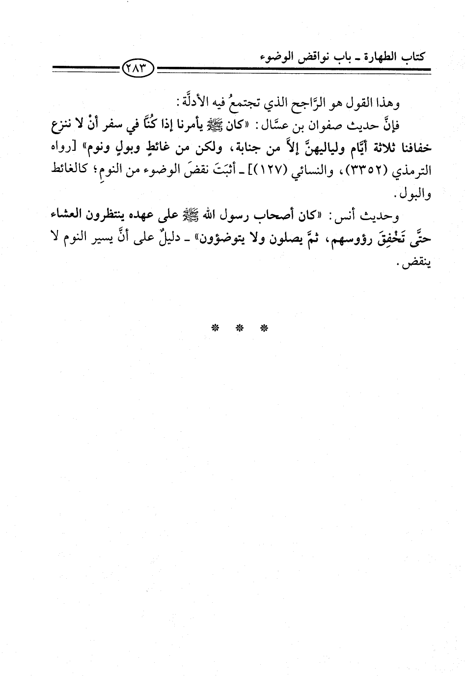 فإنَّ حديث صفوان بن عسَّال: "كان -صلى الله عليه وسلم- يأمرنا إذا كُنَّا في سفر أنْ لا ننزع خفافنا ثلاثة أيَّام ولياليهنَّ إلاَّ من جنابة، ولكن من غائطٍ وبولٍ ونوم" [رواه الترمذي (3352)، والنسائي (127)]-أثبَتَ نقضَ الوضوء من النومِ؛ كالغائط والبول.