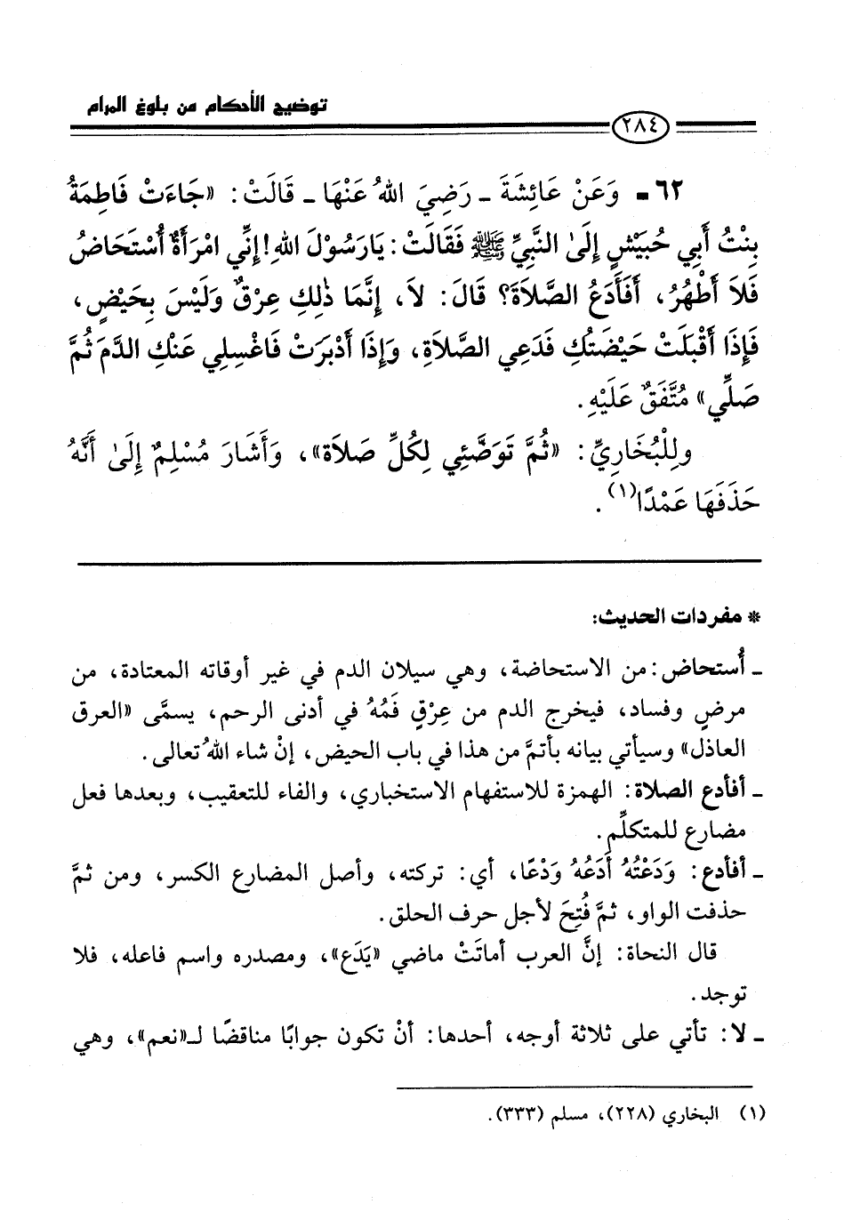 62 - وَعَنْ عَائِشَةَ -رَضِيَ اللَّهُ عَنْهَا- قَالَتْ: "جَاءَتْ فَاطِمَةُ بِنْتُ أَبِي حُبَيْشٍ إِلَى النَّبِيِّ -صلى الله عليه وسلم- فَقَالَتْ: يَا رَسُولَ اللَّهِ! إِنِّي امْرَأَةٌ أُسْتَحَاضُ فَلَا أَطْهُرُ, أَفَأَدَعُ الصَّلَاةَ? قَالَ: لاَ، إِنَّمَا ذَلِكَ عِرْقٌ وَلَيْسَ بِحَيْضٍ, فَإِذَا أَقْبَلَتْ حَيْضَتُكِ فَدَعِي الصَّلاَةِ, وَإِذَا أَدْبَرَتْ فَاغْسِلِي عَنْكِ الدَّمَ ثُمَّ صَلِّي" مُتَّفَقٌ عَلَيْهِ.