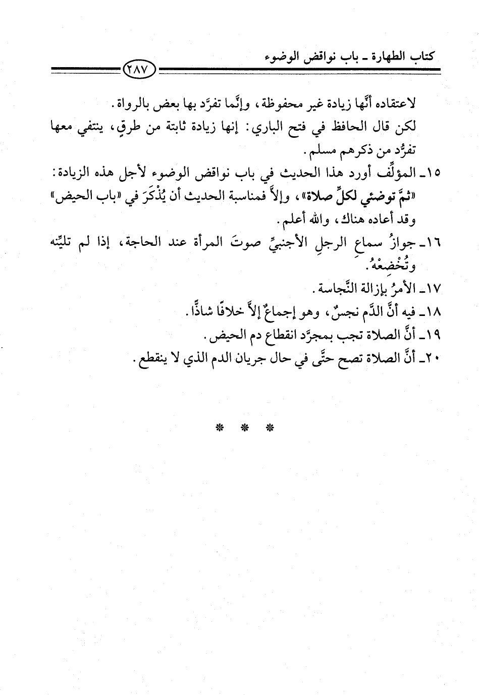 15 - المؤلِّف أورد هذا الحديث في باب نواقض الوضوء لأجل هذه الزيادة: "ثمَّ توضئي لكلِّ صلاة"، وإلاَّ فمناسبة الحديث أن يُذْكَرَ في "باب الحيض" وقد أعاده هناك، والله أعلم.