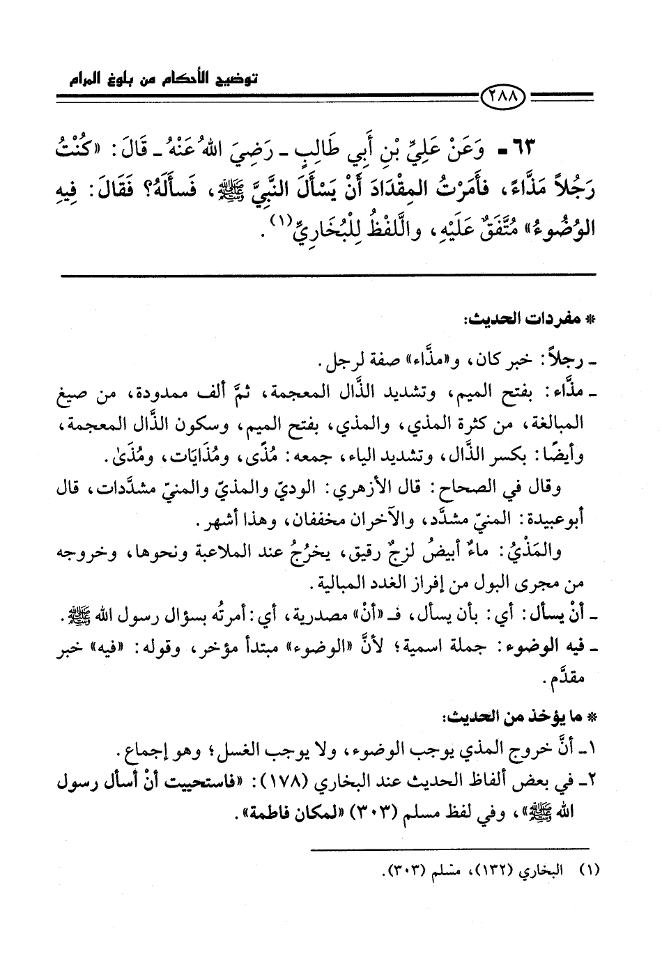 63 - وَعَنْ عَلِيِّ بْنِ أَبِي طَالِبٍ -رضي الله عنه- قَالَ: "كُنْتُ رَجُلًا مَذَّاءً, فَأَمَرْتُ الْمِقْدَادَ بْنَ الْأَسْوَدِ أَنْ يَسْأَلَ النَّبِيَّ -صلى الله عليه وسلم-، فَسَأَلَهُ? فَقَالَ: فِيهِ الْوُضُوءُ". مُتَّفَقٌ عَلَيْهِ, وَاللَّفْظُ لِلْبُخَارِيِّ (¬1).