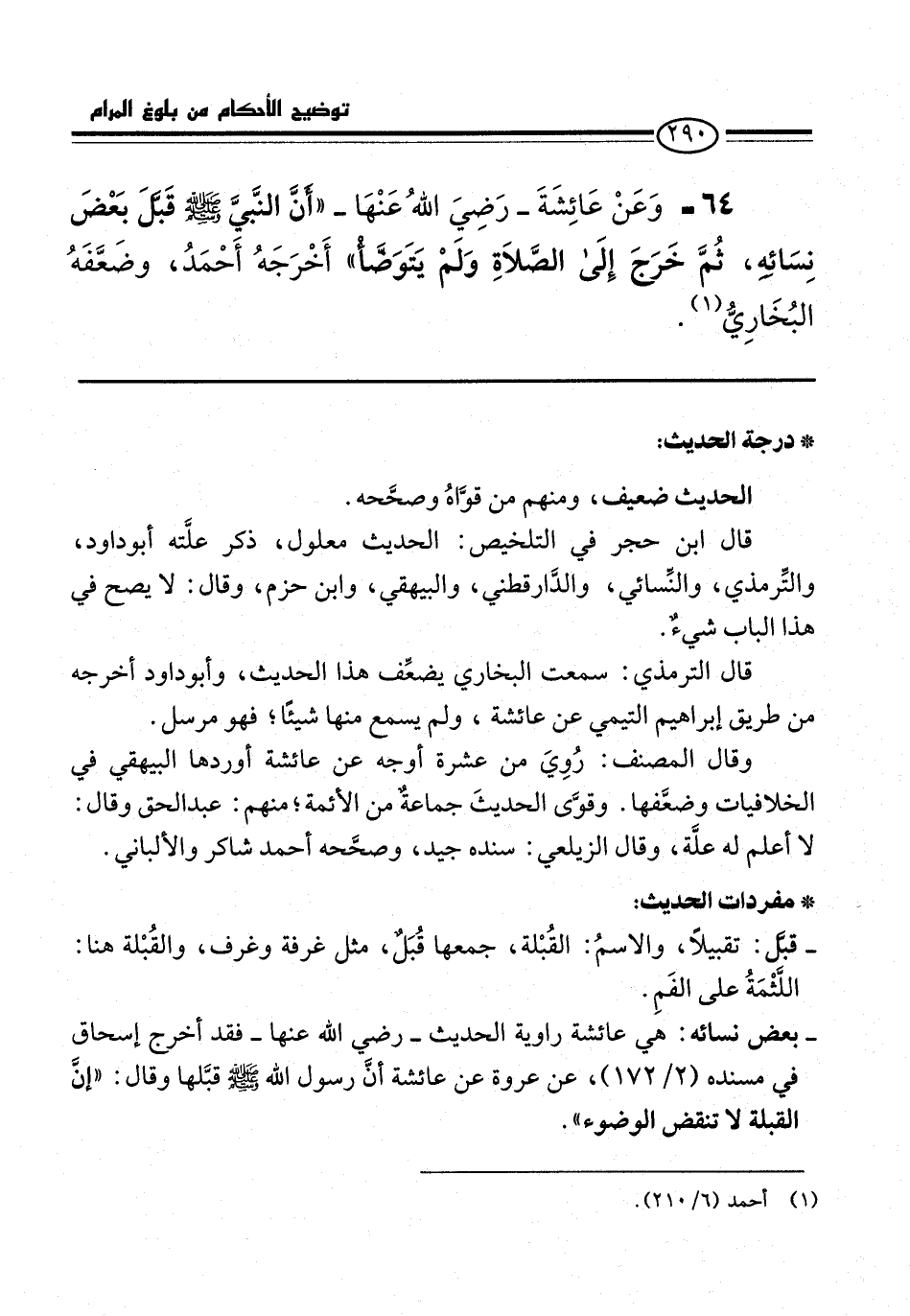 64 - وَعَنْ عَائِشَةَ -رَضِيَ اللَّهُ عَنْهَا-: "أَنَّ النَّبِيَّ -صلى الله عليه وسلم- قَبَّلَ بَعْضَ نِسَائِهِ, ثُمَّ خَرَجَ إِلَى الصَّلَاةِ وَلَمْ يَتَوَضَّأْ" أَخْرَجَهُ أَحْمَدُ, وَضَعَّفَهُ الْبُخَارِيُّ (¬1).