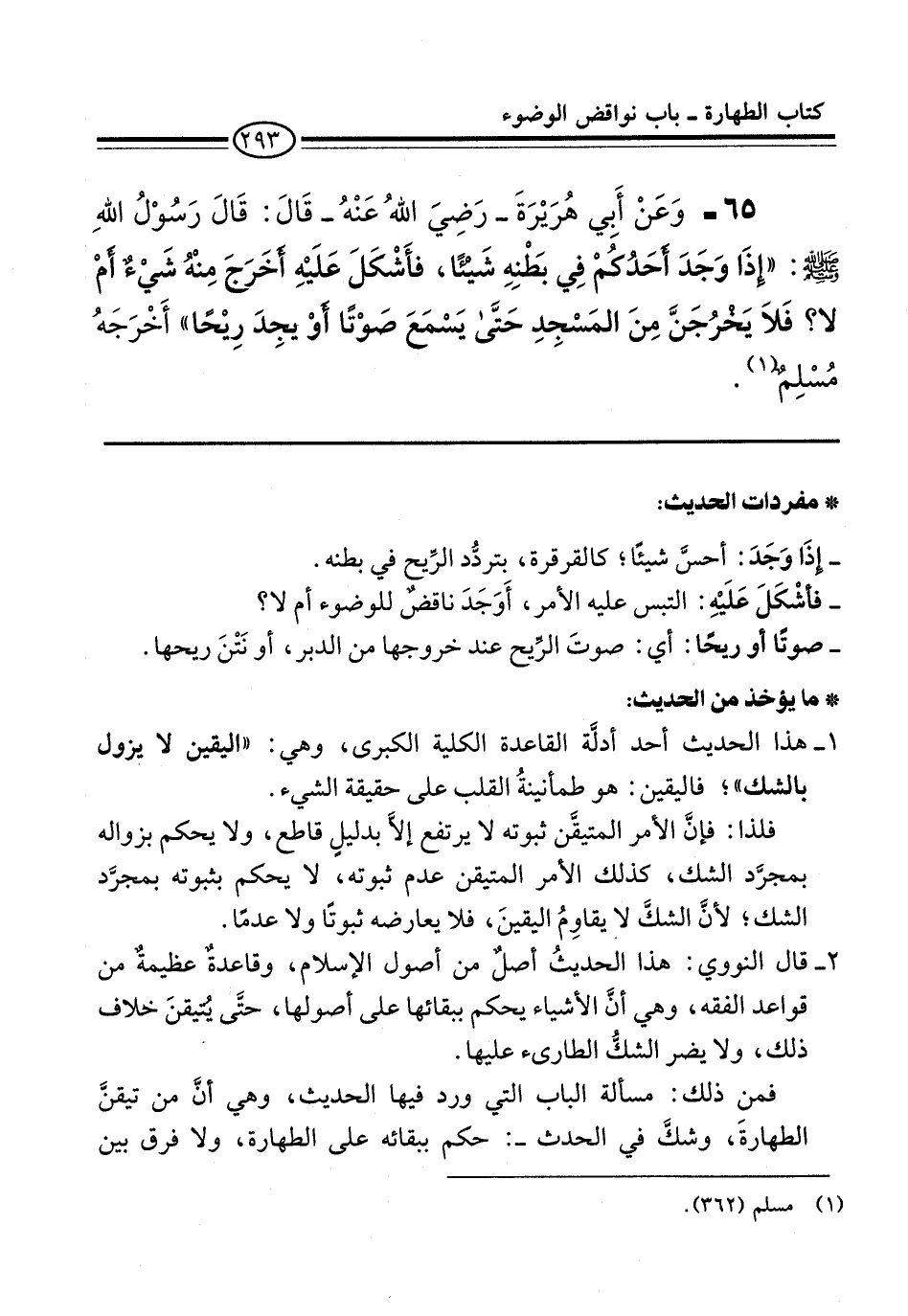 65 - وَعَنْ أَبِي هُرَيْرَةَ -رضي الله عنه- قَالَ: قَالَ رَسُولُ اللَّهِ -صلى الله عليه وسلم-: "إِذَا وَجَدَ أَحَدُكُمْ فِي بَطْنِهِ شَيْئًا, فَأَشْكَلَ عَلَيْهِ أَخَرَجَ مِنْهُ شَيْءٌ أَمْ لَا? فَلَا يَخْرُجَنَّ مِنَ الْمَسْجِدِ حَتَّى يَسْمَعَ صَوْتًا, أَوْ يَجِدَ رِيحًا". أَخْرَجَهُ مُسْلِمٌ (¬1).