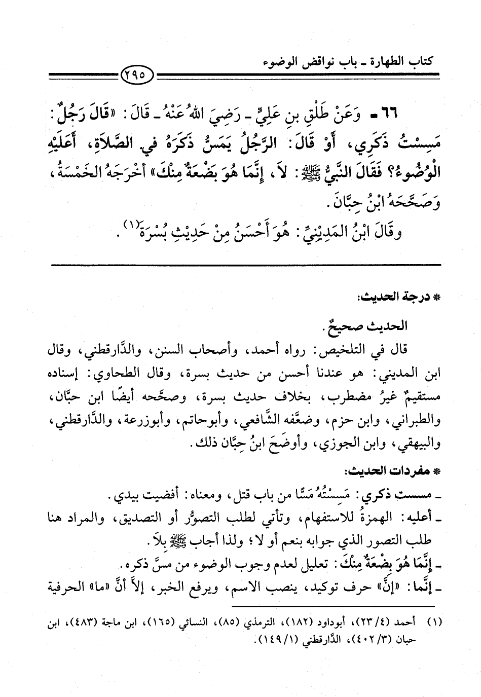 66 - وَعَنْ طَلْقِ بْنِ عَلِيٍّ -رضي الله عنه- قَالَ: "قَالَ رَجُلٌ: مَسِسْتُ ذَكَرِي، أَوْ قَالَ: الرَّجُلُ يَمَسُّ ذَكَرَهُ فِي الصَّلَاةِ, أَعَلَيْهِ الْوُضُوءٌ? فَقَالَ النَّبِيُّ -صلى الله عليه وسلم-: لاَ, إِنَّمَا هُوَ بَضْعَةٌ مِنْكَ" أَخْرَجَهُ الْخَمْسَةُ, وَصَحَّحَهُ ابْنُ حِبَّانَ.