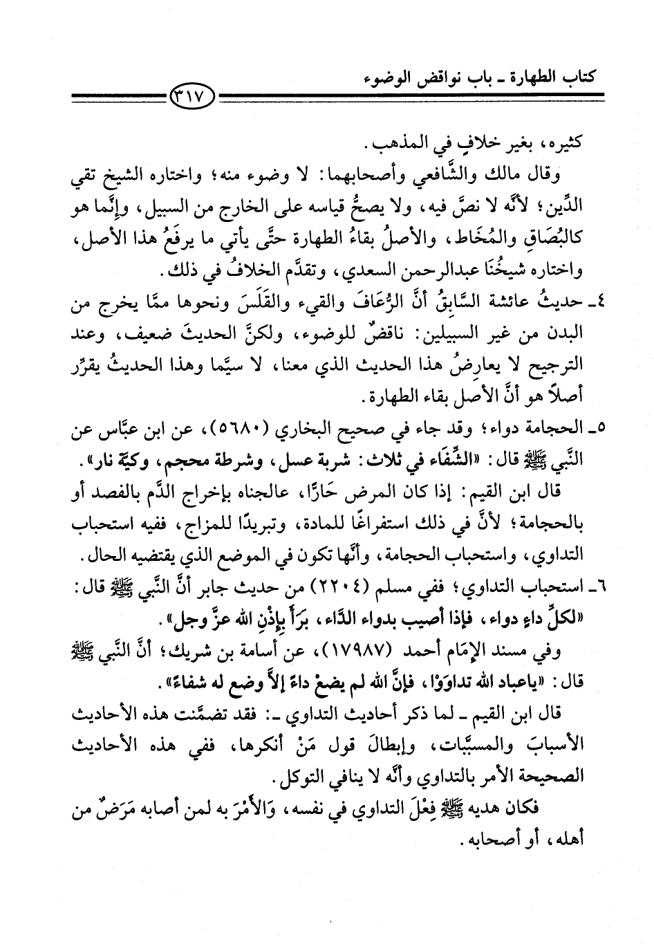 وقال مالك والشَّافعي وأصحابهما: لا وضوء منه؛ واختاره الشيخ تقي الدِّين؛ لأنَّه لا نصَّ فيه، ولا يصحُّ قياسه على الخارج من السبيل، وإِنَّما هو كالبُصاقِ والمُخَاط، والأصلُ بقاءُ الطهارة حتَّى يأتي ما يرفَعُ هذا الأصل، واختاره شيخُنَا عبد الرحمن السعدي، وتقدَّم الخلافُ في ذلك.