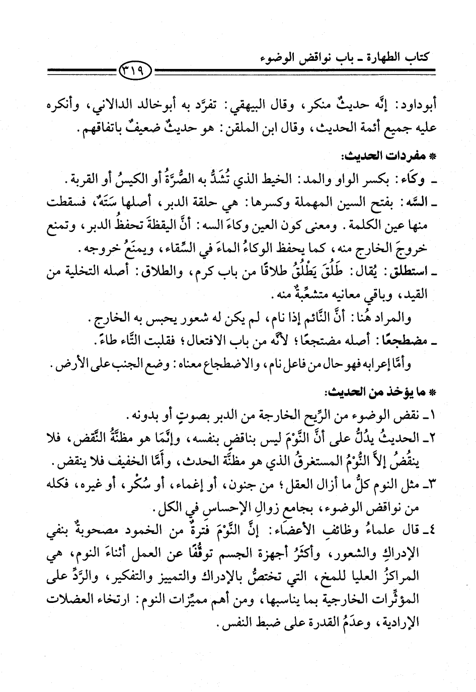 2 - الحديثُ يدُلُّ على أنَّ النَّوْمَ ليس بناقضٍ بنفسه، وإنَّما هو مظنَّةُ النَّقض، فلا ينقُضُ إلاَّ النُّوْمُ المستغرقُ الذي هو مظنَّة الحدث، وأَمَّا الخفيف فلا ينقض.
