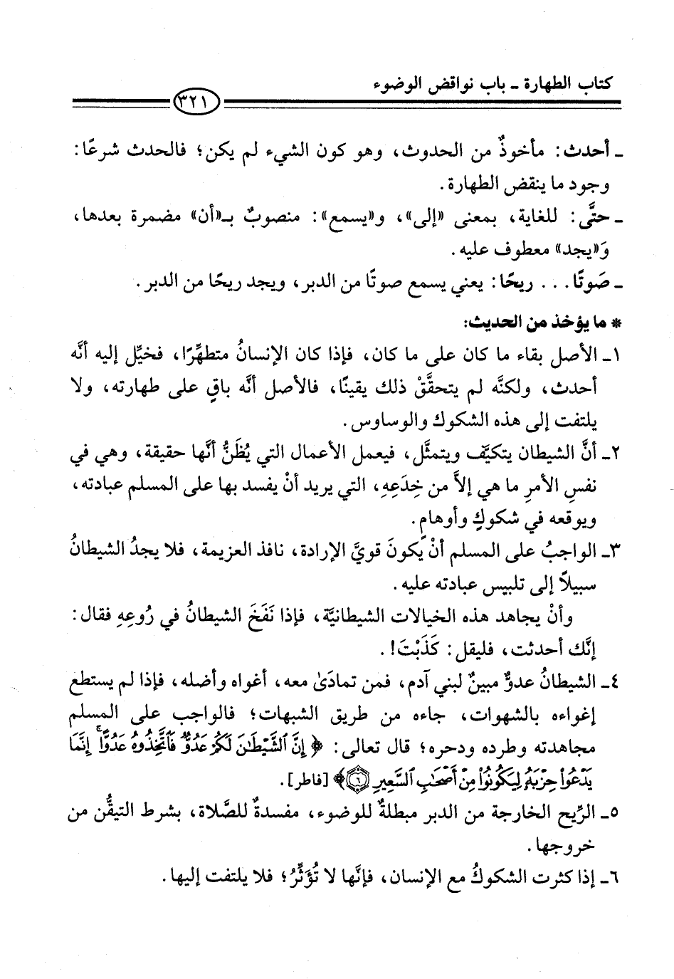 وأنْ يجاهد هذه الخيالات الشيطانيَّة، فإذا نَفَخَ الشيطانُ في رُوعِهِ فقال: إنَّك أحدثت، فليقل: كَذَبْتَ!.