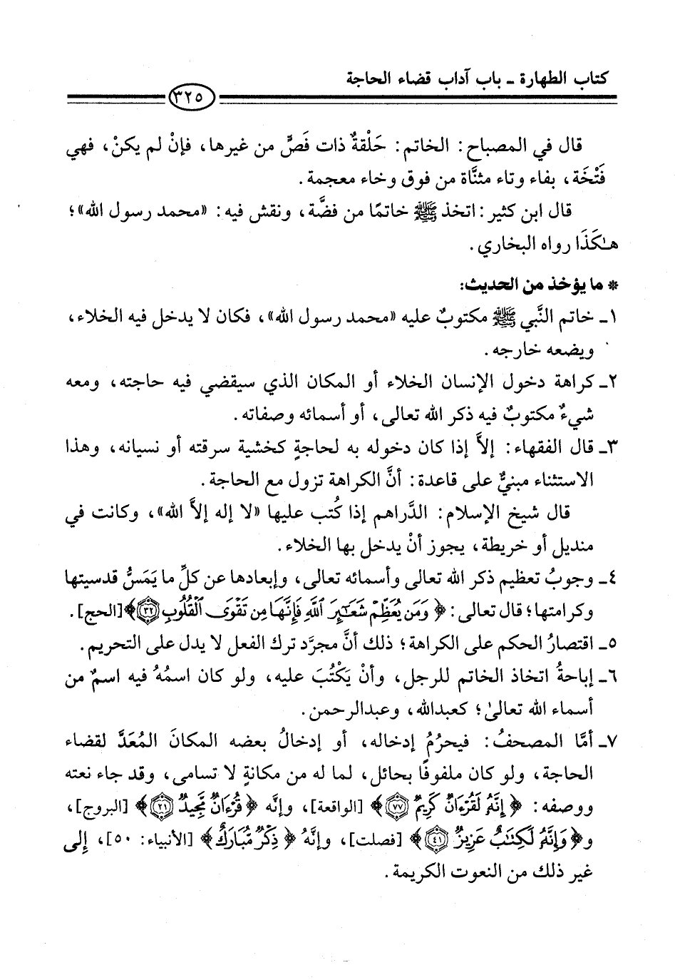 7 - أمَّا المصحفُ: فيحرُمُ إدخاله، أو إدخالُ بعضه المكانَ المُعَدَّ لقضاء الحاجة، ولو كان ملفوفًا بحائل، لما له من مكانةٍ لا تسامى، وقد جاء نعته ووصفه: {إِنَّهُ لَقُرْآنٌ كَرِيمٌ (77)} [الواقعة]، وإنَّه {قُرْآنٌ مَجِيدٌ (21)} [البروج]، و {وَإِنَّهُ لَكِتَابٌ عَزِيزٌ (41)} [فصلت]، وإنَّهُ {ذِكْرٌ مُبَارَكٌ} [الأنبياء:50]، إِلى غير ذلك من النعوت الكريمة.