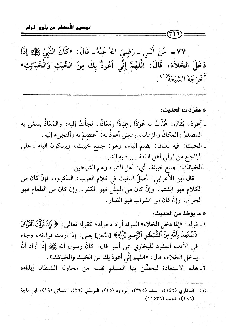 77 - عَنْ أنَسٍ -رضي الله عنه- قَالَ: "كَانَ النَّبيُّ -صلى الله عليه وسلم- إِذَا دَخَلَ الْخَلَاءَ قَالَ: اللَّهُمَّ إِنِّي أَعُوذُ بِكَ مِنَ الْخُبُثِ وَالْخَبَائِثِ" أَخْرَجَهُ السَّبْعَةُ (¬1).
