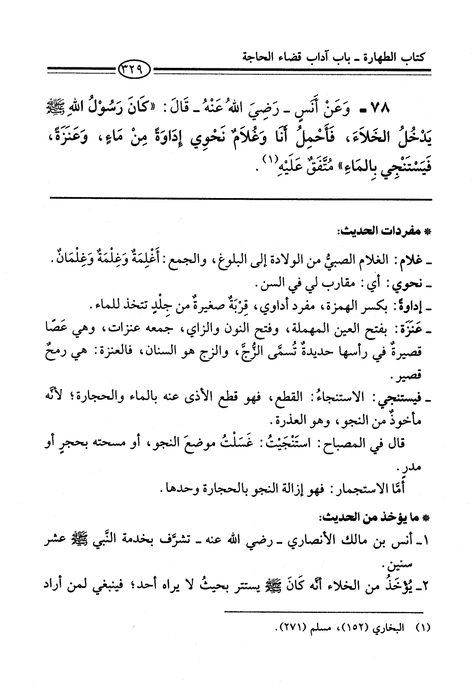 78 - وَعَنْ أَنَسٍ -رضي الله عنه- قَالَ: "كَانَ رَسُولُ اللَّهِ -صلى الله عليه وسلم- يَدْخُلُ الْخَلَاءَ, فَأَحْمِلُ أَنَا وَغُلَامٌ نَحْوِي إِدَاوَةً مِنْ مَاءٍ، وَعَنَزَةً, فَيَسْتَنْجِي بِالْمَاءِ" مُتَّفَقٌ عَلَيْهِ (¬1).