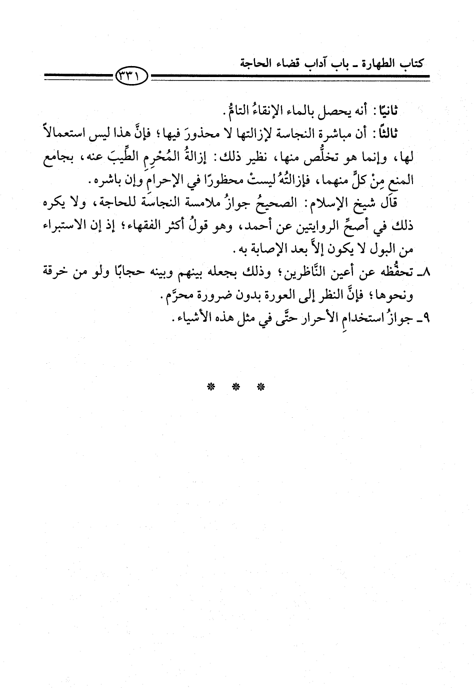 ثالثًا: أن مباشرة النجاسة لإزالتها لا محذورَ فيها؛ فإنَّ هذا ليس استعمالًا لها، وإنما هو تخلُّص منها، نظير ذلك: إزالةُ المحْرِمِ الطِّيبَ عنه، بجامع المنعِ مِنْ كلٍّ منهما، فإزالتُهُ ليستْ محظورًا في الإحرامِ وإن باشره.