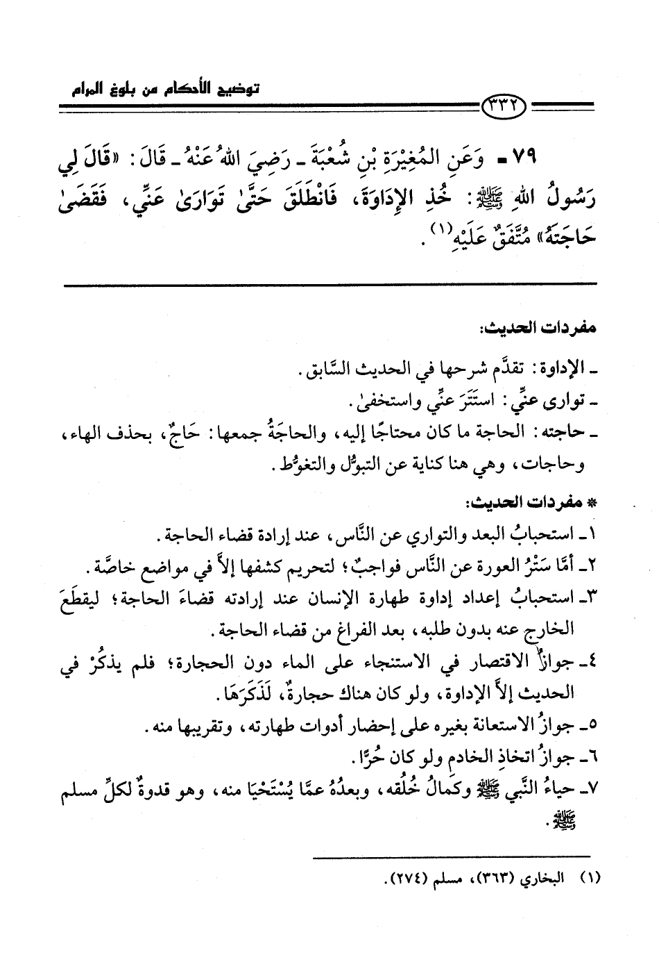 79 - وَعَنِ الْمُغِيرَةِ بْنِ شُعْبَةَ -رضي الله عنه- قَالَ: "قَالَ لِي رَسُولُ الله -صلى الله عليه وسلم-: خُذِ الْإِدَاوَةَ، فَانْطَلَقَ حَتَّى تَوَارَى عَنِّي, فَقَضَى حَاجَتَهُ" مُتَّفَقٌ عَلَيْهِ (¬1).