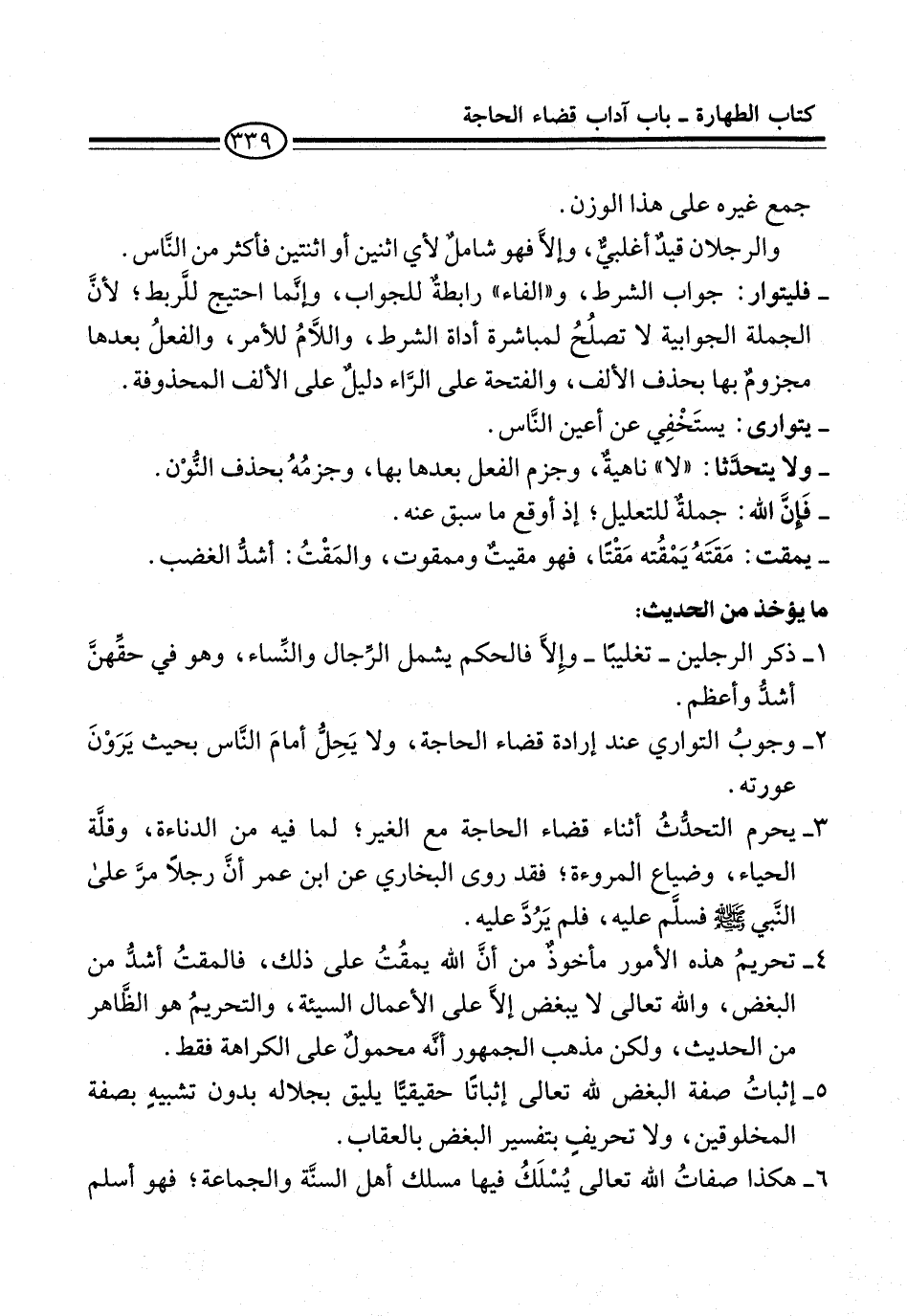 3 - يحرم التحدُّثُ أثناء قضاء الحاجة مع الغير؛ لما فيه من الدناءة، وقلَّة الحياء، وضياع المروءة؛ فقد روى البخاري عن ابن عمر أنَّ رجلاً مرَّ على النَّبي -صلى الله عليه وسلم- فسلَّم عليه، فلم يَرُدَّ عليه.