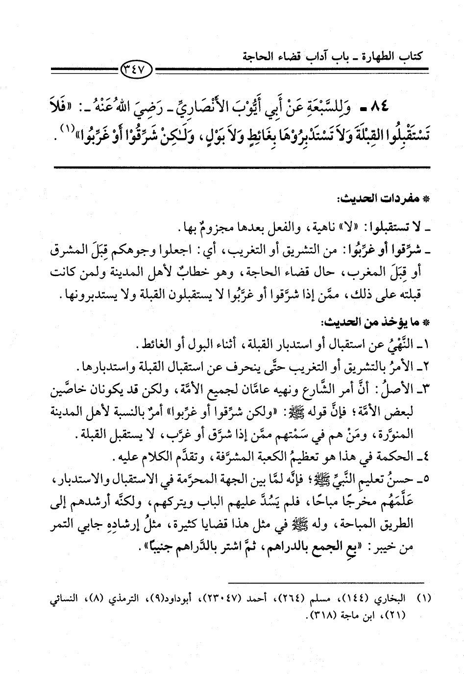 84 - وَلِلسَّبْعَةِ عَنْ أَبِي أَيُّوْبَ الأنْصارِيِّ -رضي الله عنه-: "فلَا تَسْتَقْبِلُوا الْقِبْلَةَ وَلا تَسْتَدْبِرُوْها بِغَائِطٍ وَلَا بَوْلٍ, وَلَكِنْ شَرِّقُوا أَوْ غَرِّبُوا" (¬1).