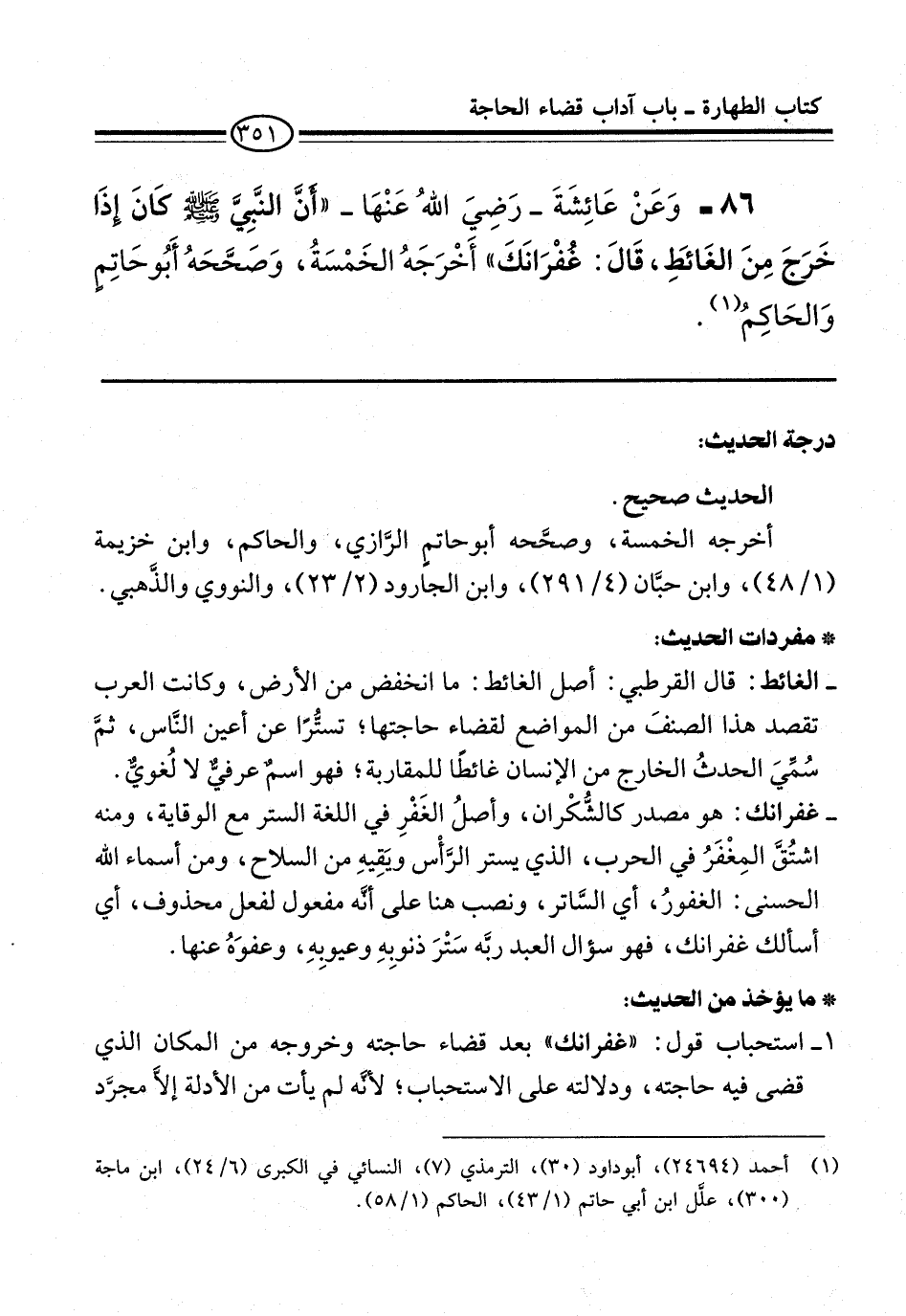 86 - وَعَنْ عَائِشَةَ -رَضِيَ اللَّهُ عَنْهَا- "أَنَّ النَّبِيَّ -صلى الله عليه وسلم- كَانَ إِذَا خَرَجَ مِنْ الْغَائِطِ قَالَ: غُفْرَانَكَ" أَخْرَجَهُ الْخَمْسَةُ، وَصَحَّحَهُ أَبُو حَاتِمٍ وَالْحَاكِمُ (¬1).