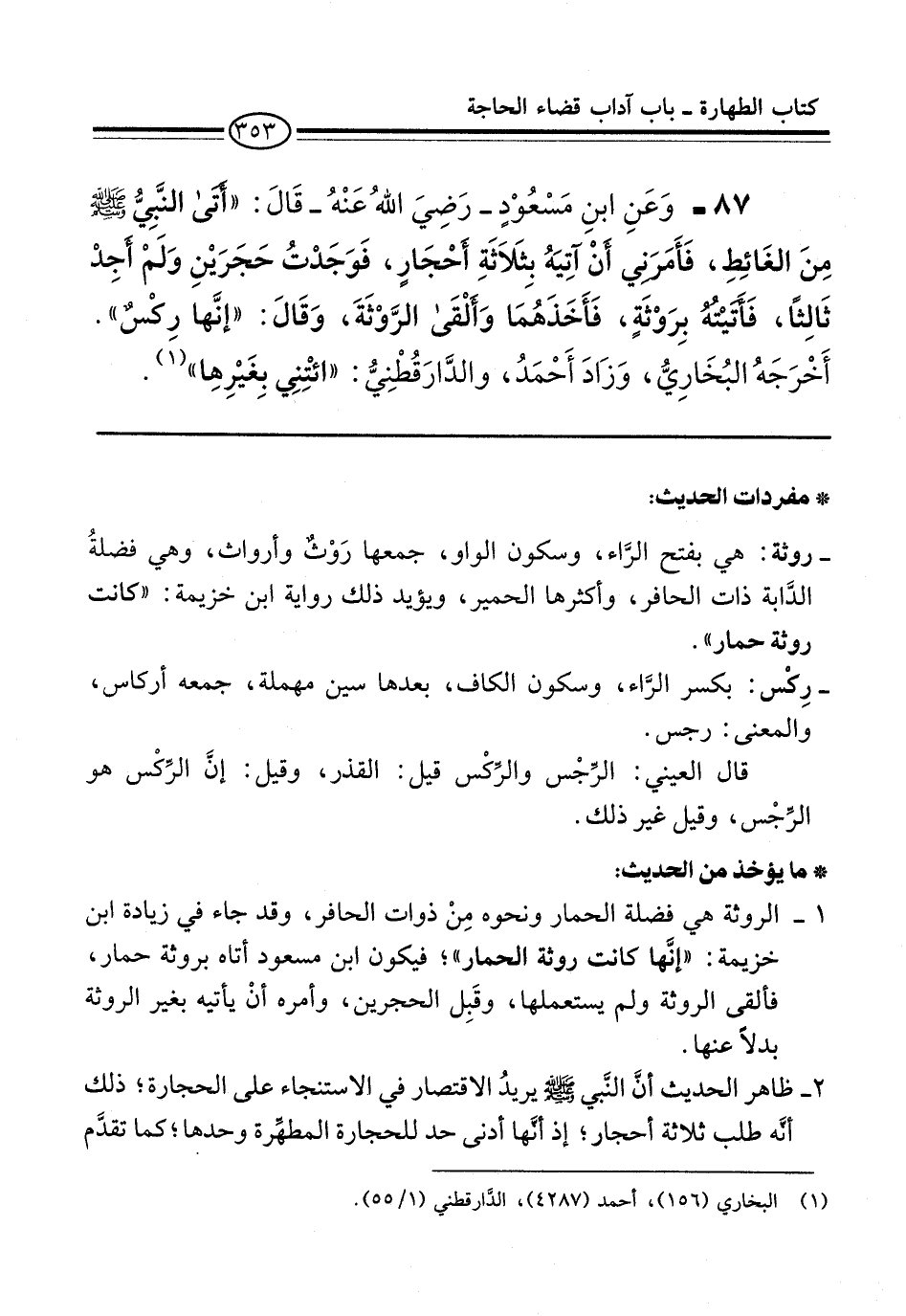 87 - وَعَنِ ابْنِ مَسْعُودٍ -رضي الله عنه- قَالَ: "أَتَى النَّبِيُّ -صلى الله عليه وسلم- مِنَ الْغَائِطَ, فَأَمَرَنِي أَنْ آتِيَهُ بِثَلَاثَةِ أَحْجَارٍ, فَوَجَدْتُ حَجَرَيْنِ وَلَمْ أَجِدْ ثَالِثًا، فَأَتَيْتُهُ بِرَوْثَةٍ، فَأَخَذَهُمَا وَأَلْقَى الرَّوْثَةَ, وَقَالَ: "إنَّها رِكْسٌ". أَخْرَجَهُ الْبُخَارِيُّ، وزَادَ أَحْمَدُ, وَالدَّارَقُطْنِيُّ: "ائْتِنِي بِغَيْرِهَا" (¬1).