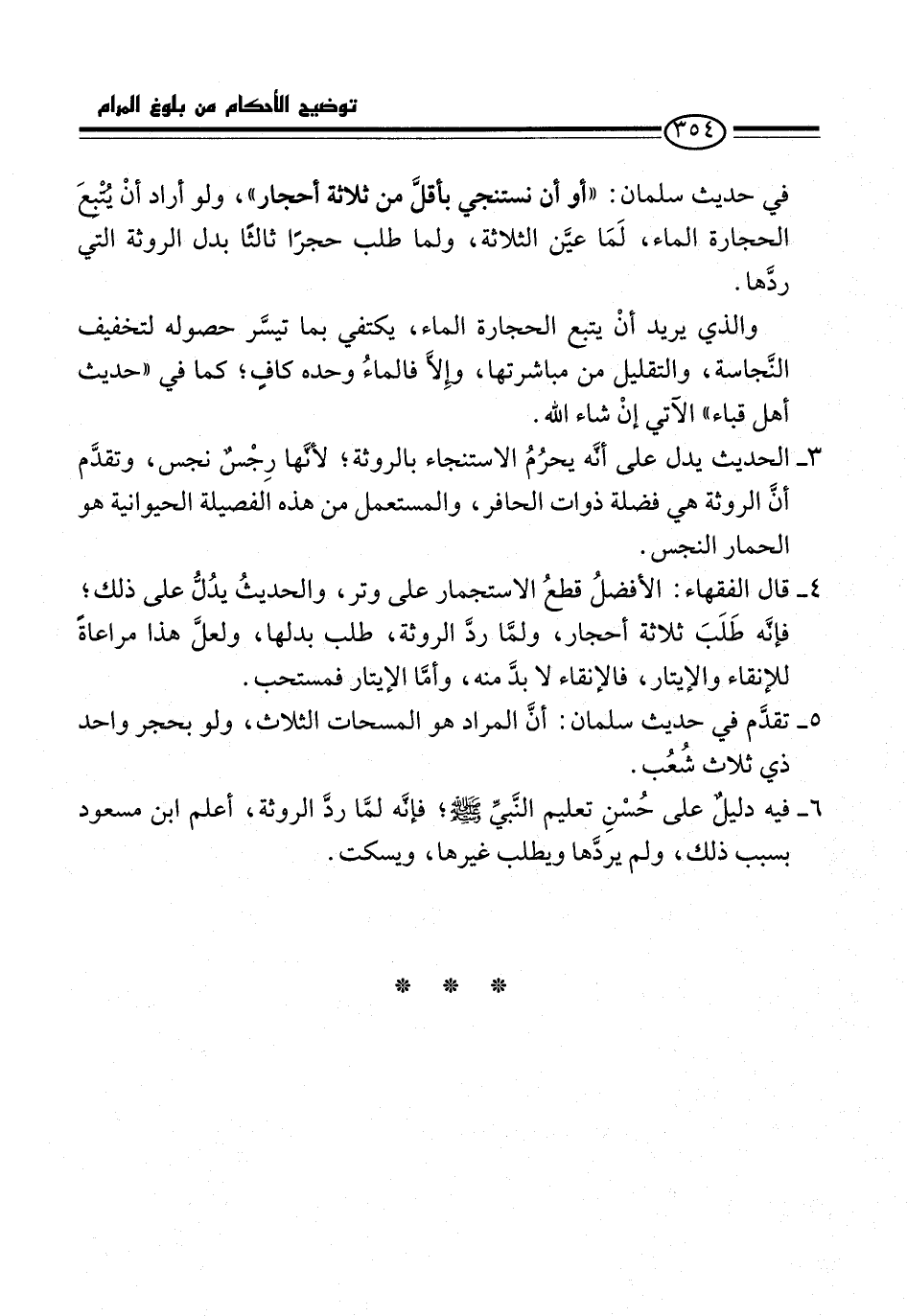 في حديث سلمان: "أو أن نستنجي بأقلَّ من ثلاثة أحجار"، ولو أراد أنْ يُتْبعَ الحجارة الماء، لَمَا عيَّن الثلاثة، ولما طلب حجرًا ثالثًا بدل الروثة التي ردَّها.