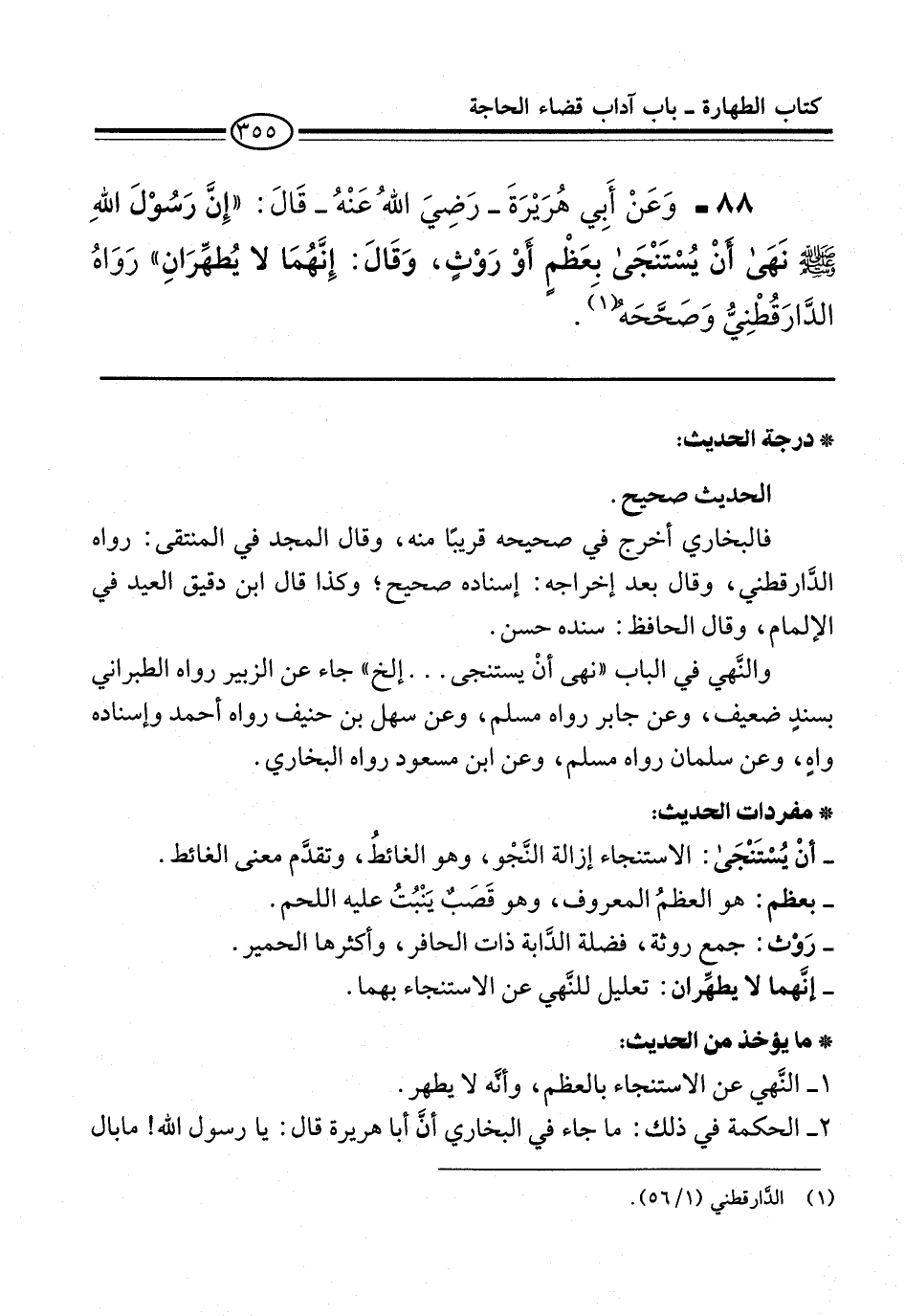 88 - وَعَنْ أَبِي هُرَيْرَةَ -رضي الله عنه- قال: "إِنَّ رَسُولَ اللَّهِ -صلى الله عليه وسلم- نَهَى أَنْ يُسْتَنْجَى بِعَظْمٍ أَوْ رَوْثٍ، وَقَالَ: إِنَّهُمَا لَا يُطَهِّرَانِ" رَوَاهُ الدَّارَقُطْنِيُّ وَصَحَّحَهُ (¬1).