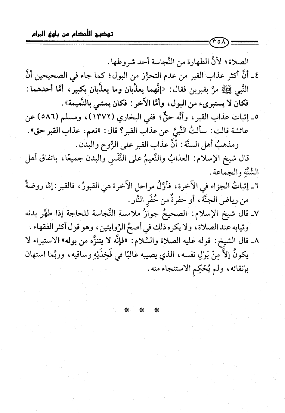 4 - أنَّ أكثر عذاب القبر من عدم التحرُّز من البول؛ كما جاء في الصحيحين أنَّ النَّبي -صلى الله عليه وسلم- مرَّ بقبرين فقال: "إنَّهما يعذَّبان وما يعذَّبان بكبير، أمَّا أحدهما: فكان لا يستبرىء من البول، وأمَّا الآخر: فكان يمشي بالنَّميمة".
