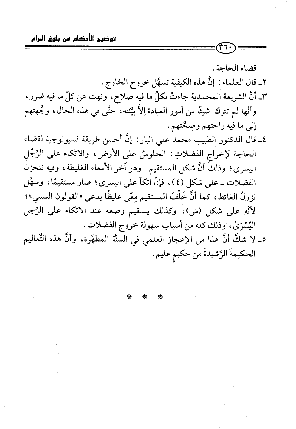 4 - قال الدكتور الطبيب محمد علي البار: إنَّ أحسن طريقة فسيولوجية لقضاء الحاجة لإخراجِ الفضلاتِ: الجلوسُ على الأرض، والاتكاء على الرِّجْلِ اليسرى؛ وذلك أن شكل المستقيم -وهو آخر الأمعاء الغليظة، وفيه تنخزن الفضلات- على شكل (4)، فإنْ اتكأ على اليسرى؛ صار مستقيمًا، وسهُل نزولُ الغائط، كما أنَّ خَلْفَ المستقيم مِعًى غليظًا يدعى "القولون السيني"؛ لأنَّه على شكل (س)، وكذلك يستقيم وضعه عند الاتكاء على الرِّجل اليُسْرَى، وذلك كله من أسباب سهولة خروج الفضلات.