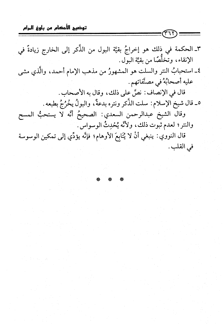 5 - قال شيخ الإِسلام: سلت الذَّكر ونتره بدعةٌ، والبولُ يخْرُجُ بطبعه.