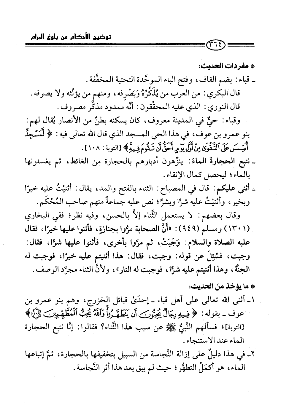 1 - أثنى الله تعالى على أهل قباء -إحدَى قبائل الخزرج، وهم بنو عمرو بن عوف -بقوله: {فِيهِ رِجَالٌ يُحِبُّونَ أَنْ يَتَطَهَّرُوا وَاللَّهُ يُحِبُّ الْمُطَّهِّرِينَ (108)} [التوبة]؛ فسألهم النَّبيُّ -صلى الله عليه وسلم- عن سبب هذا الثَّناء؟ فقالوا: إنَّا نتبع الحجارة الماء عند الاستنجاء.