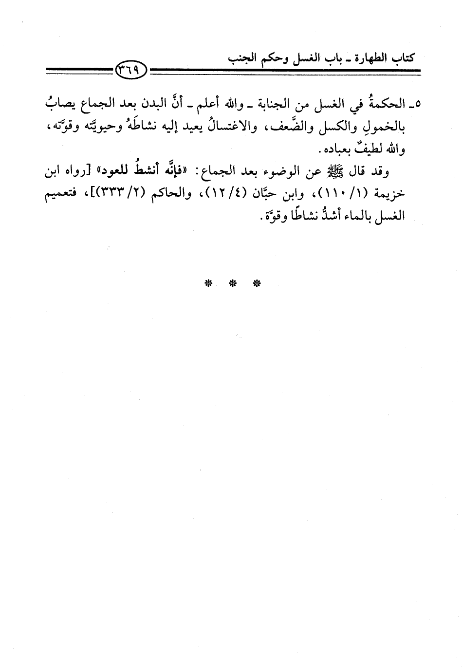وقد قال -صلى الله عليه وسلم- عن الوضوء بعد الجماع: "فإنَّه أنشطُ للعود" [رواه ابن خزيمة (1/ 110)، وابن حبَّان (4/ 12)، والحاكم (2/ 333)]، فتعميم الغسمل بالماء أشدُّ نشاطاً وقوَّة.