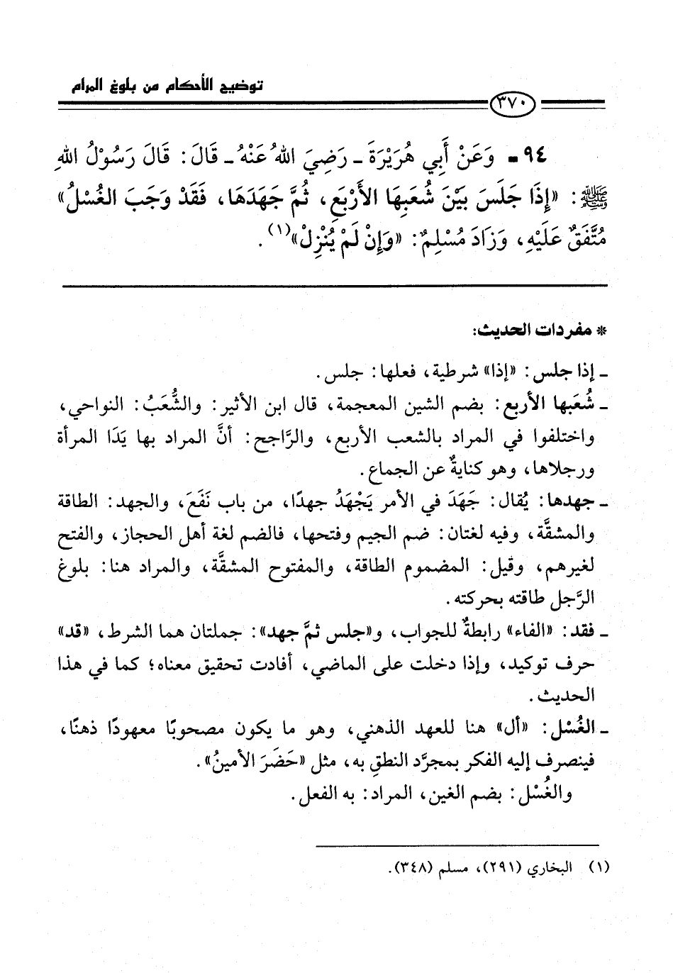 94 - وَعَنْ أَبِي هُرَيْرَةَ -رضي الله عنه- قَالَ: قَالَ رَسُولُ اللَّهِ -صلى الله عليه وسلم-: "إِذَا جَلَسَ بَيْنَ شُعَبِهَا الْأَرْبَعِ, ثُمَّ جَهَدَهَا, فَقَدْ وَجَبَ الْغُسْلُ" مُتَّفَقٌ عَلَيْهِ، وَزَادَ مُسْلِمٌ: "وَإِنْ لَمْ يُنْزِلْ" (¬1).