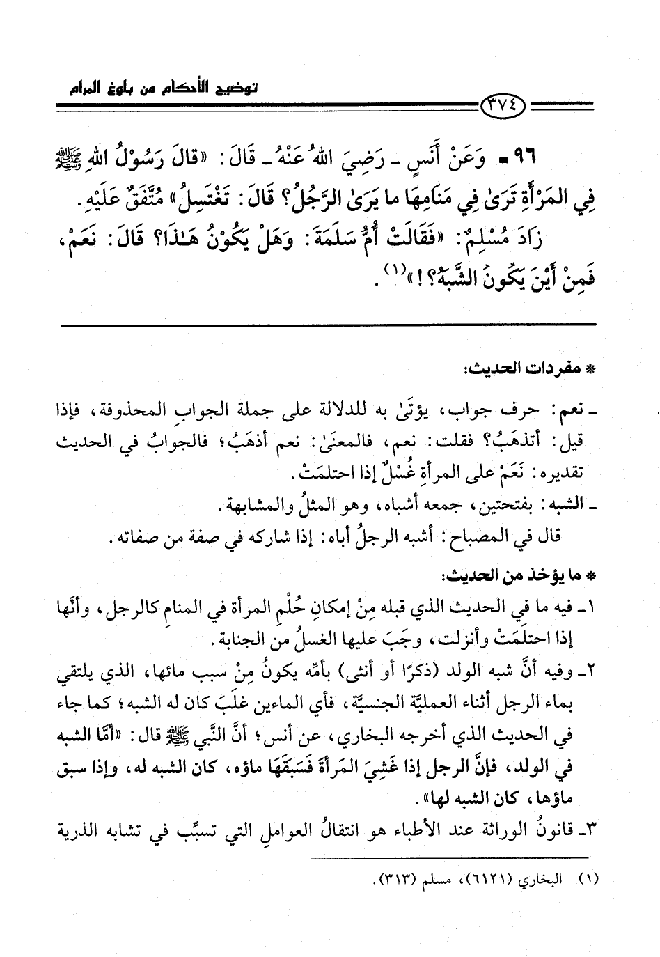 96 - وَعَنْ أَنَسٍ -رضي الله عنه- قَالَ: "قَالَ رَسُولُ اللَّهِ -صلى الله عليه وسلم- فِي الْمَرْأَةِ تَرَى فِي مَنَامِهَا مَا يَرَى الرَّجُلُ؟ قَالَ: تَغْتَسِلُ" مُتَّفَقٌ عَلَيْهِ.
