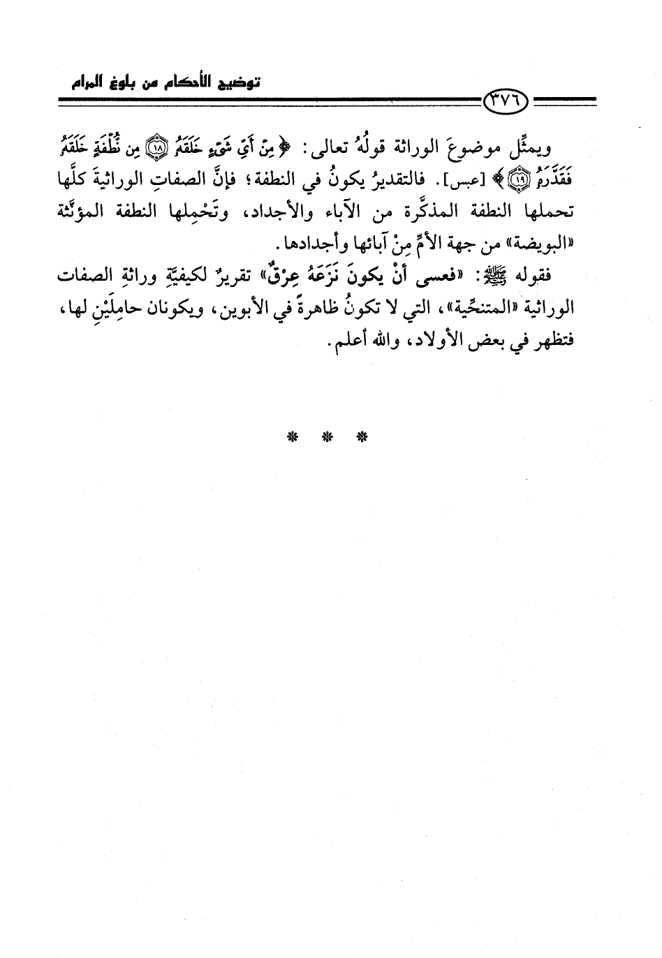ويمثِّل موضوعَ الوراثة قولُهُ تعالى: {مِنْ أَيِّ شَيْءٍ خَلَقَهُ (18) مِنْ نُطْفَةٍ خَلَقَهُ فَقَدَّرَهُ (19)} [عبس]. فالتقديرُ يكونُ في النطفة؛ فإنَّ الصفاتِ الوراثيةَ كلَّها تحملها النطفة المذكَّرة من الآباء والأجداد، وتَحْمِلها النطفة المؤنَّثة "البويضة" من جهة الأمِّ مِنْ آبائها وأجدادها.