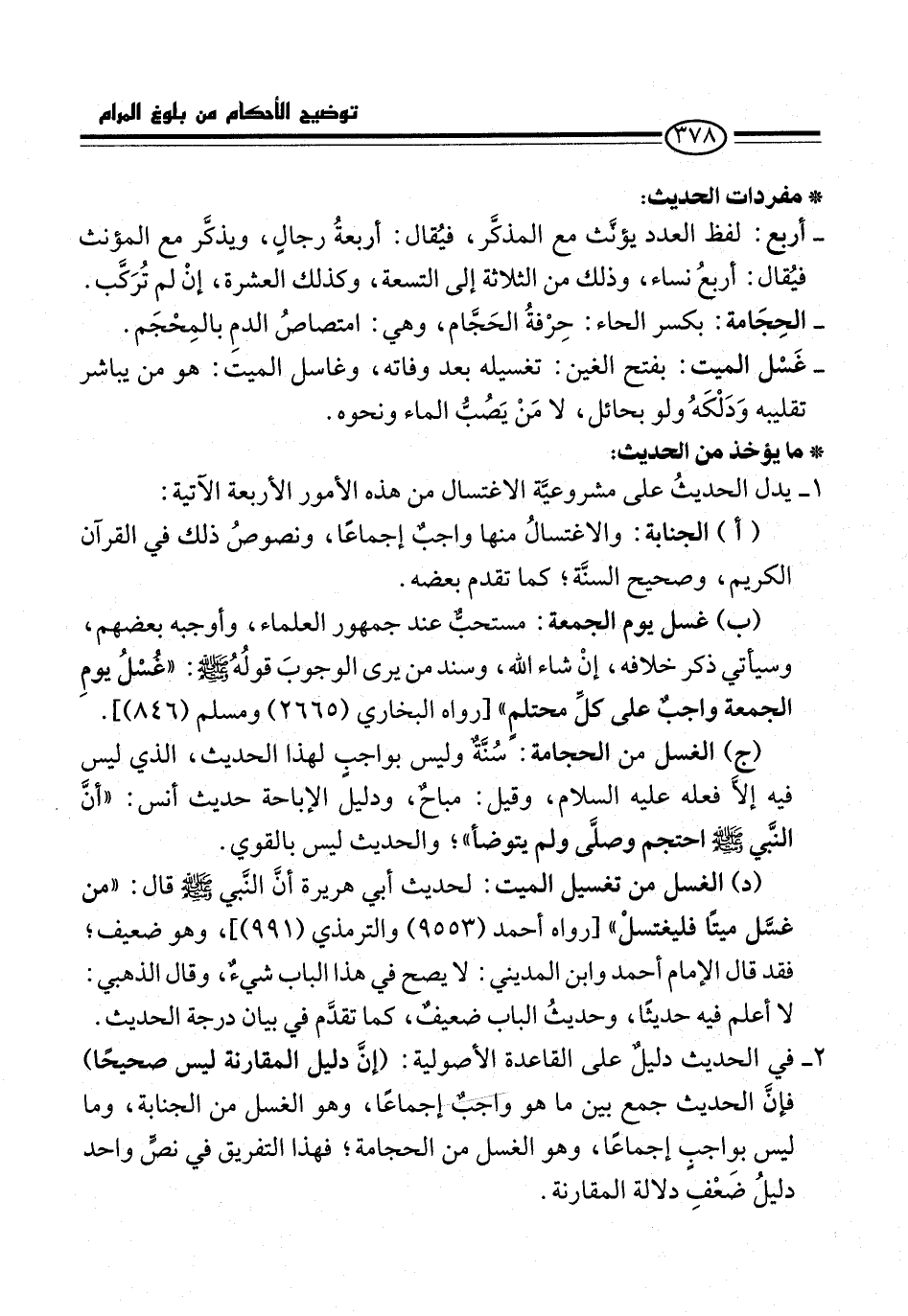 (ج) الغسل من الحجامة: سُنَّةٌ وليس بواجبٍ لهذا الحديث، الذي ليس فيه إلاَّ فعله عليه السلام، وقيل: مباحٌ، ودليل الإباحة حديث أنس: "أنَّ النَّبي -صلى الله عليه وسلم- احتجم وصلَّى ولم يتوضأ"؛ والحديث ليس بالقوي.