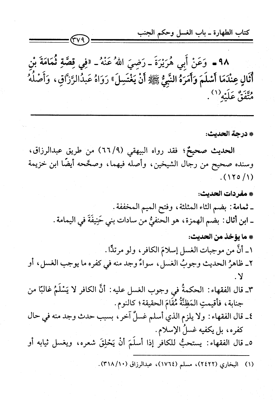98 - وَعَنْ أَبِي هُرَيْرَةَ -رضي الله عنه- "فِي قِصَّةِ ثُمَامَةَ بْنِ أُثَالٍ عِنْدَمَا أَسْلَم وَأَمَرَهُ النَّبِيُّ -صلى الله عليه وسلم- أَنْ يَغْتَسِلَ" رَوَاهُ عَبْدُ الرَّزَّاقِ، وَأَصْلُهُ مُتَّفَقٌ عَلَيْهِ (¬1).