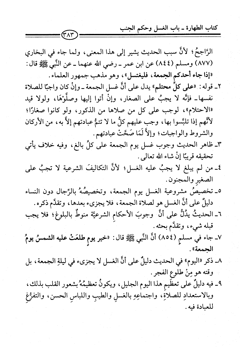2 - قوله: "على كلِّ محتلم" يدل على أنَّ غسل الجمعة -وإنْ كان واجبًا للصلاة نفسها- فإنَّه لا يجبُ على الصغار، وإنْ أتوا إليها وصلَّوْهَا، ولولا قيد "الاحتلام"، لوجب على كل من صلاها من الذكور، ولو كانوا صغارًا؛ لأنَّهم إذا تلبَّسوا بها، وجب عليهم كلُّ ما لا تتمُّ عبادتهم إلاَّ به، من الأركان والشروط والواجبات؛ وإلاَّ لَمَا صَحَّتْ عبادتهم.
