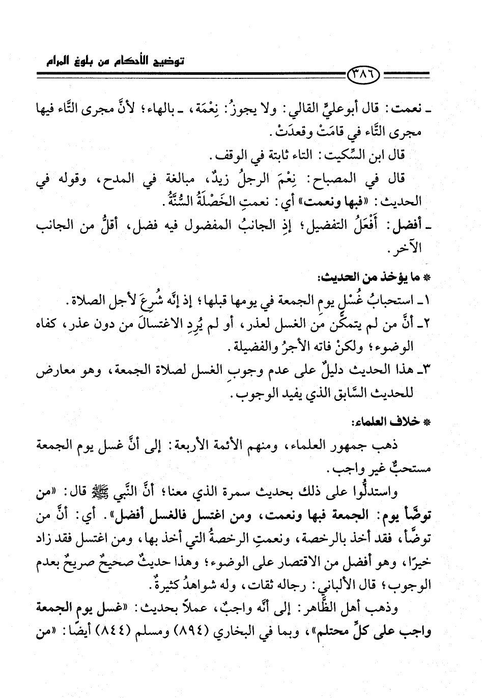 3 - هذا الحديث دليلٌ على عدم وجوبِ الغسل لصلاة الجمعة، وهو معارض للحديث السَّابق الذي يفيد الوجوب.