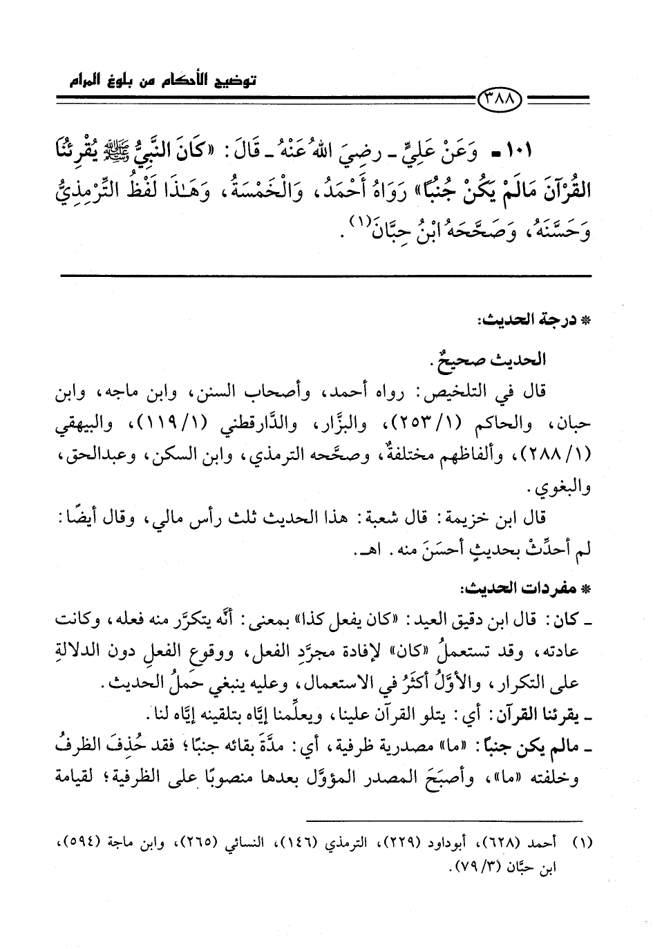 101 - وَعَنْ عَلِيٍّ -رضي الله عنه- قَالَ: "كَانَ النَّبيُّ -صلى الله عليه وسلم- يُقْرِئُنَا الْقُرْآنَ مَا لَمْ يَكُنْ جُنُبًا" رَوَاهُ أَحْمَدُ، وَالْخَمْسَةُ, وَهَذَا لَفْظُ التِّرْمِذِيُّ وَحَسَّنَةُ, وَصَحَّحَهُ ابْنُ حِبَّانَ (¬1).