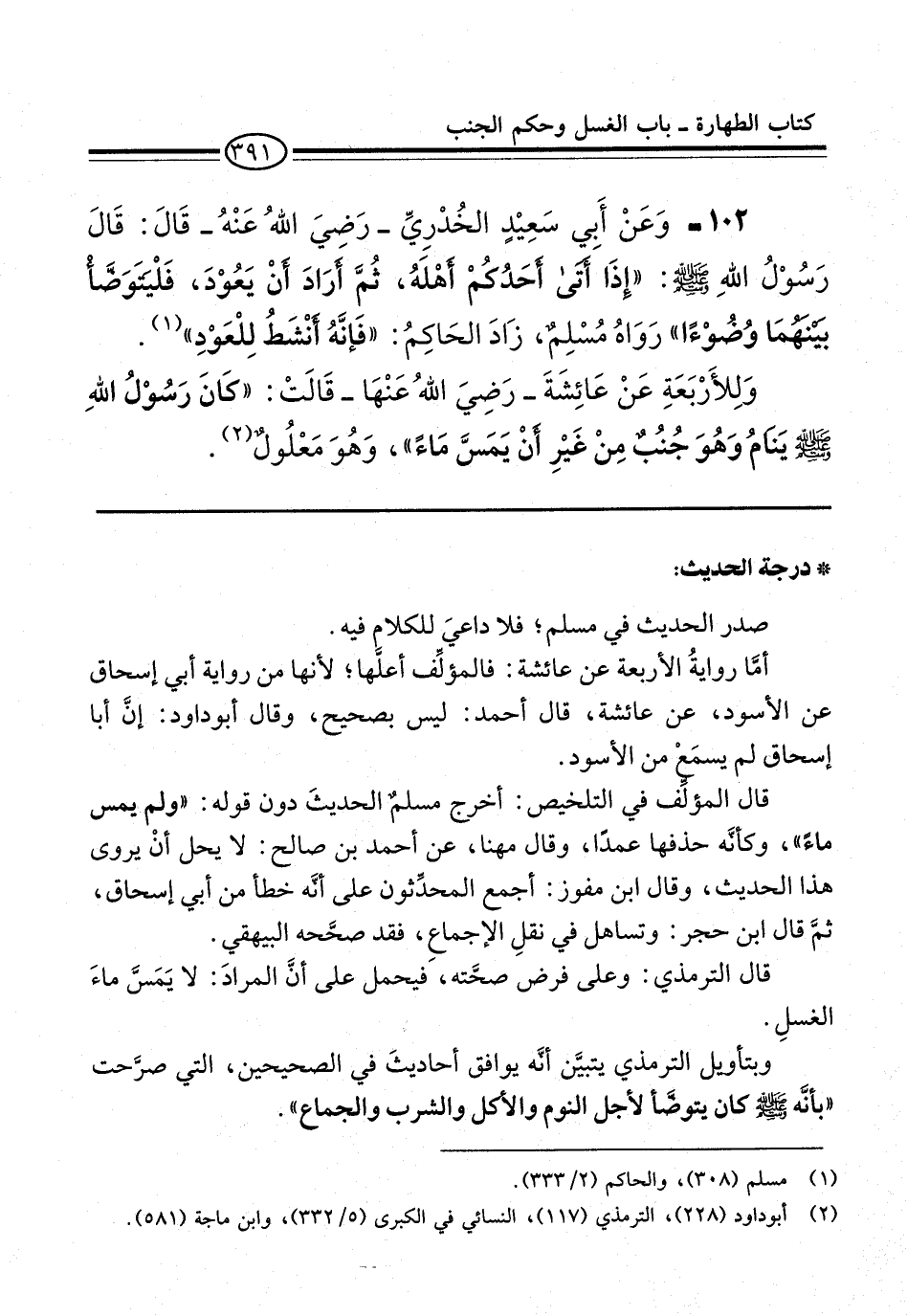 102 - وَعَنْ أَبِي سَعِيدٍ الْخُدْرِيِّ -رضي الله عنه- قَالَ: قَالَ رَسُولُ اللَّهِ -صلى الله عليه وسلم-: "إِذَا أَتَى أَحَدُكُمْ أَهْلَهُ, ثُمَّ أَرَادَ أَنْ يَعُودَ، فَلْيَتَوَضَّأْ بَيْنَهُمَا وُضُوءًا" رَوَاهُ مُسْلِمٌ، زَادَ الْحَاكِمُ: "فَإِنَّهُ أَنْشَطُ لِلْعَوْدِ" (¬1).