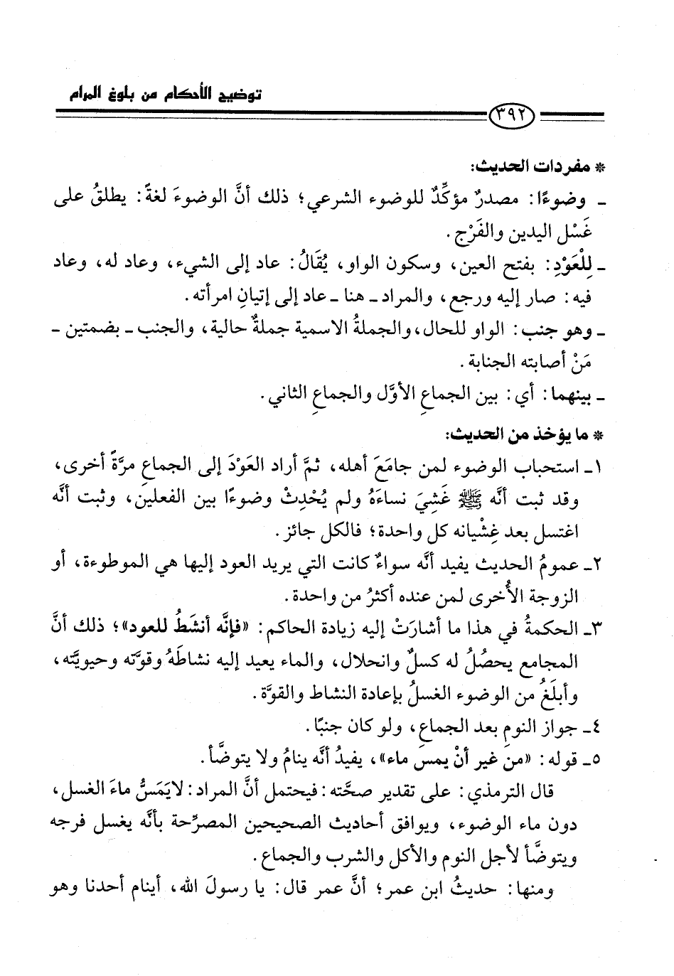 1 - استحباب الوضوء لمن جامَعَ أهله، ثُمَّ أراد العَوْدَ إلى الجماعِ مرَّةً أخرى، وقد ثبت أنَّه -صلى الله عليه وسلم- غَشِيَ نساءَهُ ولم يُحْدِثْ وضوءًا بين الفعلين، وثبت أنَّه اغتسل بعد غِشْيانه كل واحدة؛ فالكل جائز.