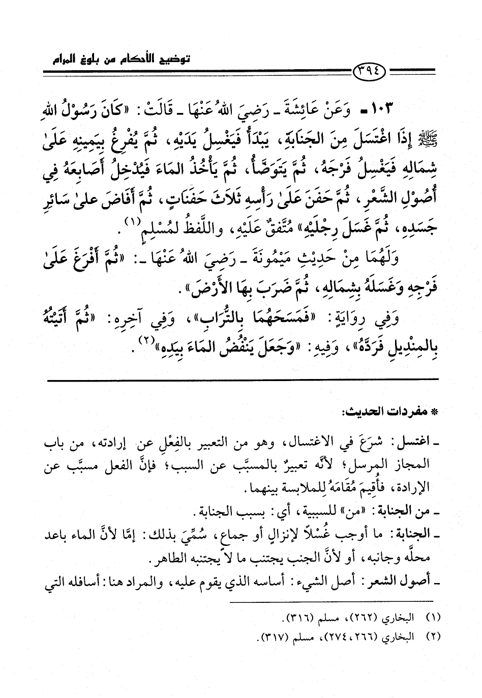 103 - وَعَنْ عَائِشَةَ -رَضِيَ اللَّهُ عَنْهَا- قَالَتْ: "كَانَ رَسُولُ اللَّهِ -صلى الله عليه وسلم- إِذَا اغْتَسَلَ مِنَ الْجَنَابَةِ، يَبْدَأُ فَيَغْسِلُ يَدَيْهِ, ثُمَّ يُفْرِغُ بِيَمِينِهِ عَلَى شِمَالِهِ, فَيَغْسِلُ فَرْجَهُ, ثُمَّ يَتَوَضَّأُ, ثُمَّ يَأْخُذُ الْمَاءَ فَيُدْخِلُ أَصَابِعَهُ فِي أُصُولِ الشَّعْرِ, ثُمَّ حَفَنَ عَلَى رَأْسِهِ ثَلَاثَ حَفَنَاتٍ, ثُمَّ أَفَاضَ عَلَى سَائِرِ جَسَدِهِ, ثُمَّ غَسَلَ رِجْلَيْهِ" مُتَّفَقٌ عَلَيْهِ, وَاللَّفْظُ لِمُسْلِمٍ (¬1).