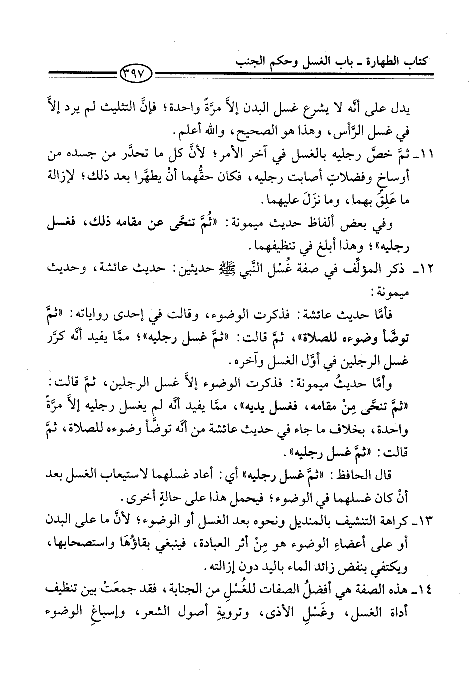 14 - هذه الصفة هي أفضلُ الصفات للغُسْلِ من الجنابة، فقد جمعَتْ بين تنظيف أداة الغسل، وغَسْلِ الأذى، وترويةِ أصول الشعر، وإسباغِ الوضوء