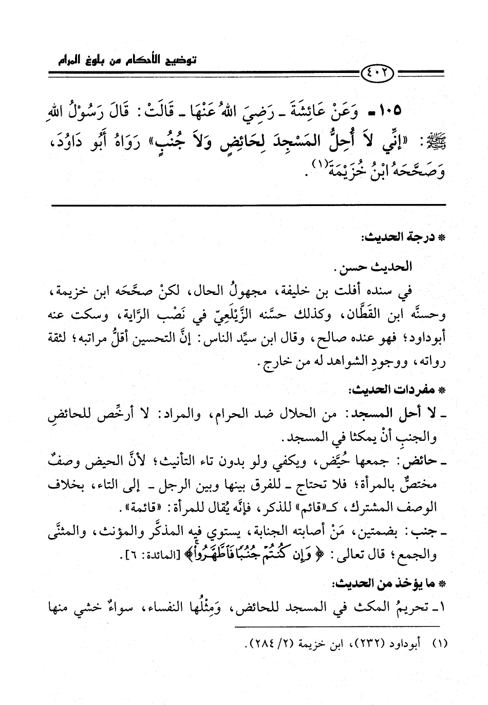105 - وَعَنْ عَائِشَةَ -رَضِيَ اللَّهُ عَنْهَا- قَالَتْ: قَالَ رَسُولُ اللَّهِ -صلى الله عليه وسلم-: "إِنِّي لَا أُحِلُّ الْمَسْجِدَ لِحَائِضٍ وَلَا جُنُبٍ". رَوَاهُ أَبُو دَاوُدَ, وَصَحَّحَهُ ابْنُ خُزَيْمَةَ (¬1).