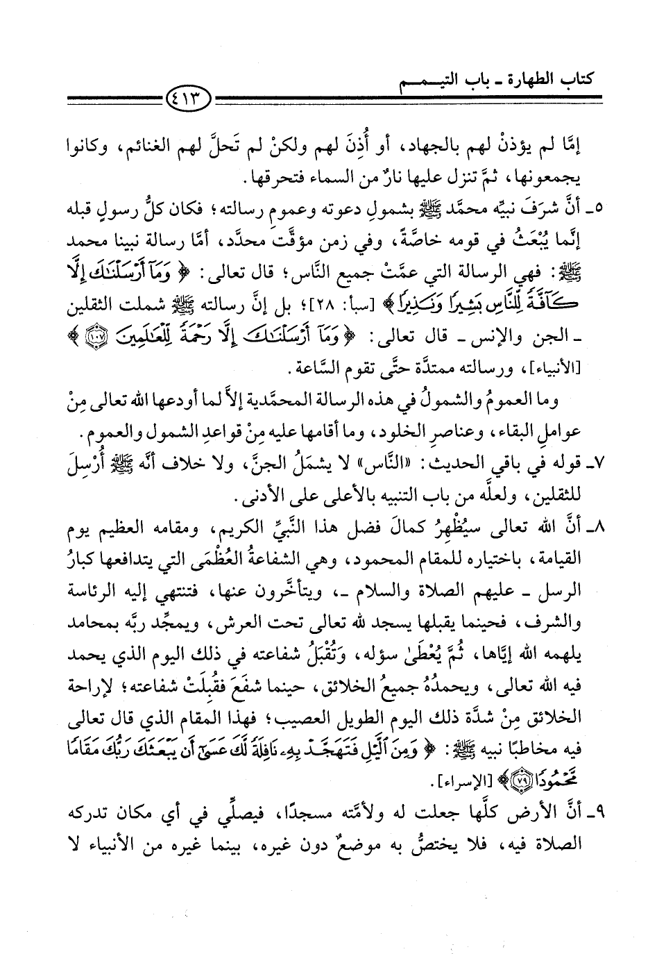 9 - أنَّ الأرض كلَّها جعلت له ولأمَّته مسجدًا، فيصلِّي في أي مكان تدركه الصلاة فيه، فلا يختصُّ به موضعٌ دون غيره، بينما غيره من الأنبياء لا