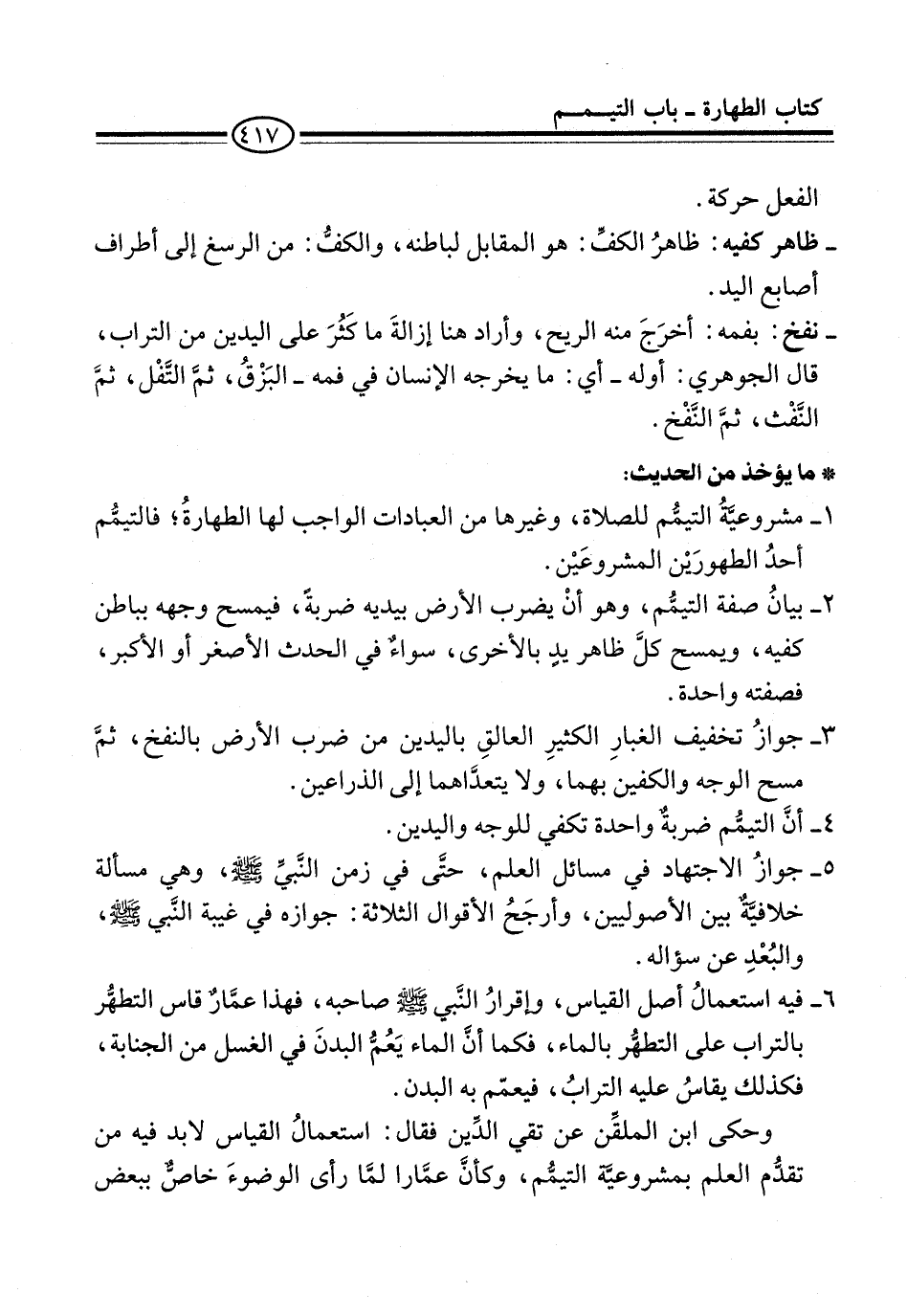 2 - بيانُ صفة التيمُّم، وهو أنْ يضرب الأرض بيديه ضربةً، فيمسح وجهه بباطن كفيه، ويمسح كلَّ ظاهر يدٍ بالأخرى، سواءٌ في الحدث الأصغر أو الأكبر، فصفته واحدة.