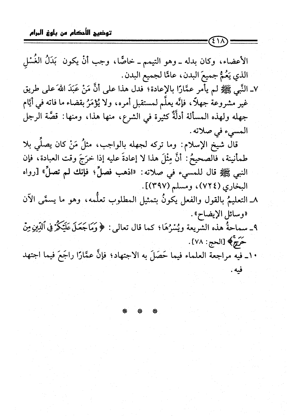 7 - النَّبي -صلى الله عليه وسلم- لم يأمر عمَّارًا بالإعادة؛ فدل هذا على أنَّ مَنْ عَبَدَ الله على طريق غير مشروعة جهلاً، فإنَّه يعلَّم لمستقبل أمره، ولا يُؤْمَرُ بقضاء ما فاته في أيَّام جهله ولهذه المسألة أدلَّةٌ كثيرة في الشرع، منها هذا، ومنها: قصَّة الرجل المسيء في صلاته.