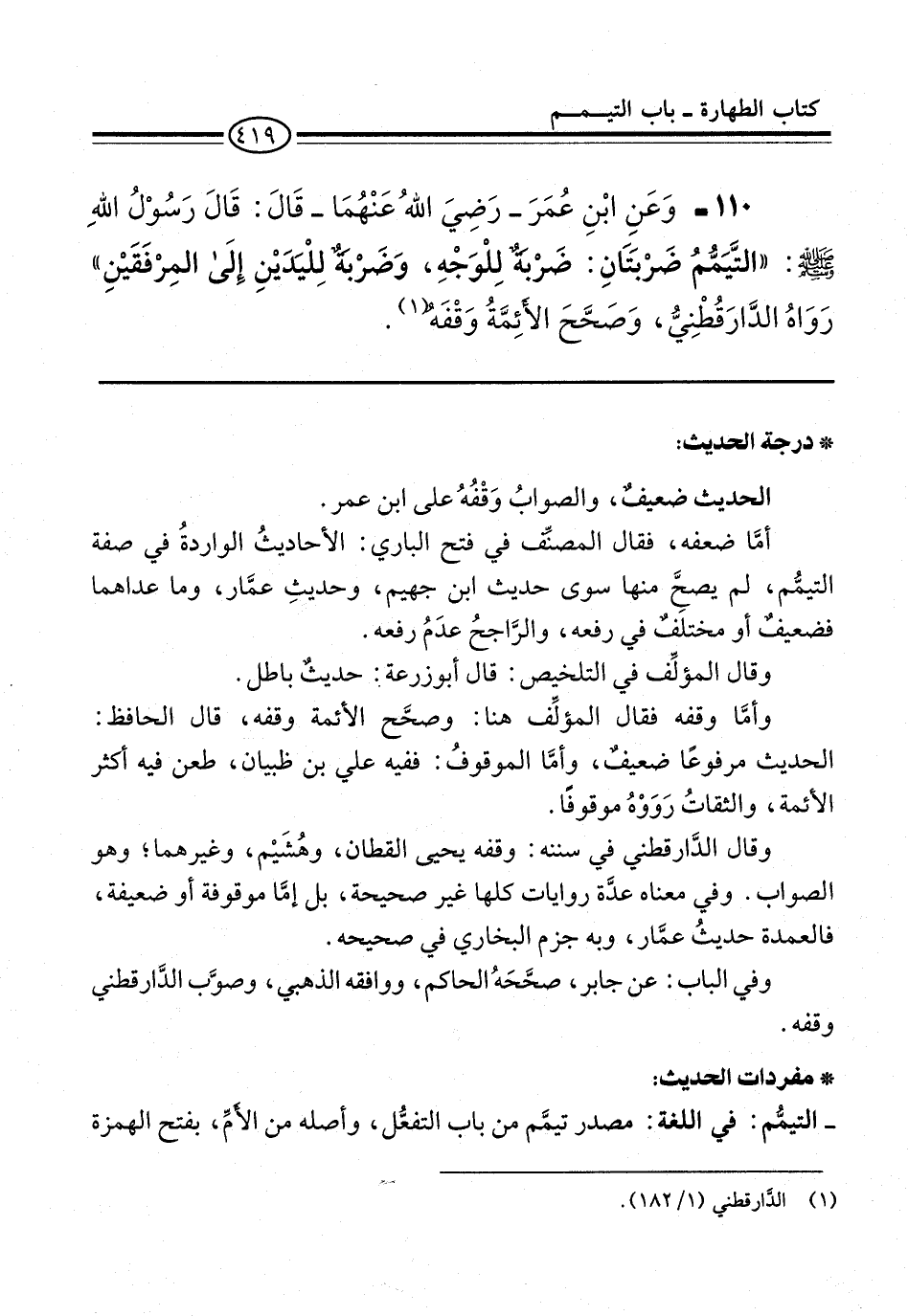 110 - وَعَنِ ابْنِ عُمَرَ -رَضِيَ اللَّهُ عَنْهُمَا- قَالَ: قَالَ رَسُولُ اللَّهِ -صلى الله عليه وسلم-: "التَّيَمُّمُ ضَرْبَتَانِ: ضَرْبَةٌ لِلْوَجْهِ, وَضَرْبَةٌ لِلْيَدَيْنِ إِلَى الْمِرْفَقَيْنِ" رَوَاهُ الدَّارَقُطْنِيُّ, وَصَحَّحَ الْأَئِمَّةُ وَقْفَهُ (¬1).