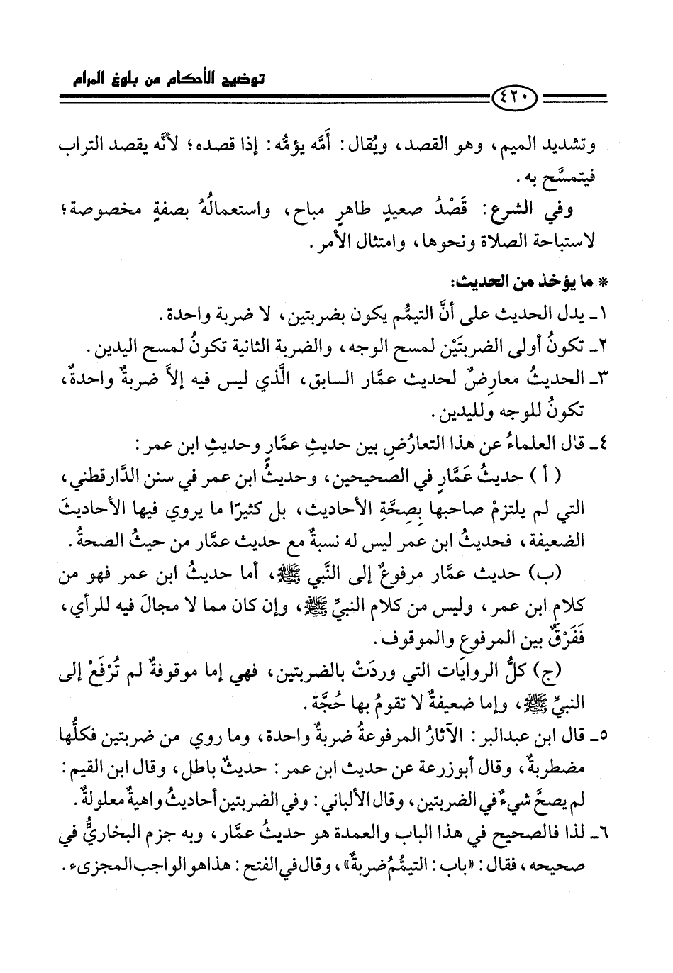 6 - لذا فالصحيح في هذا الباب والعمدة هو حديثُ عمَّار، وبه جزم البخاريُّ في صحيحه، فقال: "باب: التيمُّمُ ضربةٌ"، وقال في الفتح: هذا هو الواجب المجزىء.