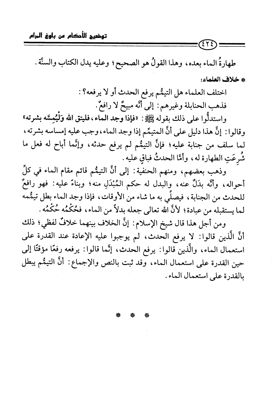 ومن أجل هذا قال شيخ الإسلام: إنَّ الخلاف بينهما خلافٌ لفظي؛ ذلك أنَّ الَّذين قالوا: لا يرفع الحدث، لم يوجبوا عليه الإعادة عند القدرة على استعمال الماء، والَّذين قالوا: يرفع الحدث، إنَّما قالوا: يرفعه رفعًا مؤقتًا إلى حين القدرة على استعمال الماء، وقد ثبت بالنص والإجماع: أنَّ التيمُّم يبطل بالقدرة على استعمال الماء.