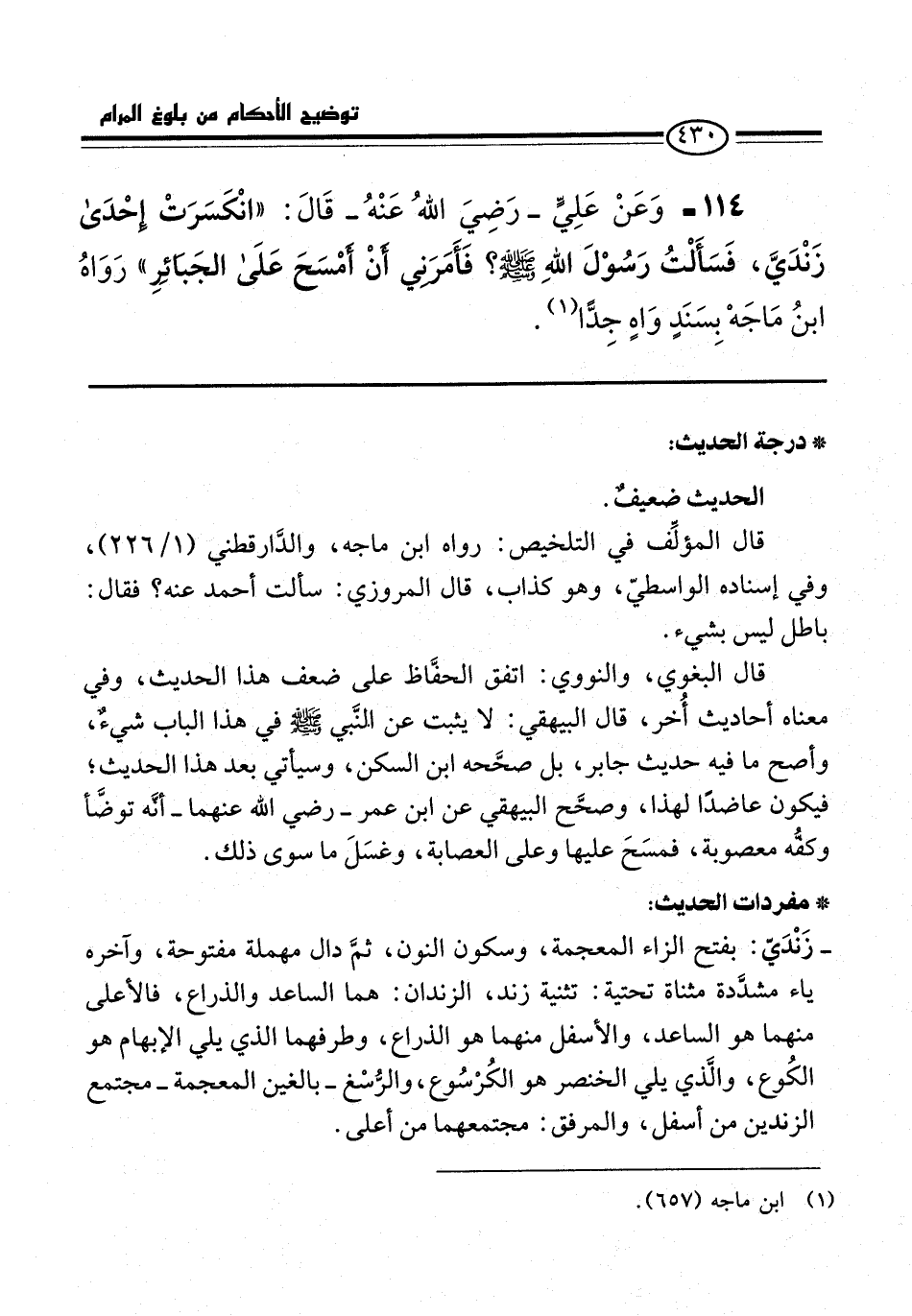 114 - وَعَنْ عَلِيٍّ -رضي الله عنه- قَالَ: "انْكَسَرَتْ إِحْدَى زَنْدَيَّ، فَسَأَلَتُ رَسُولَ اللَّهِ -صلى الله عليه وسلم-؟ فَأَمَرَنِي أَنْ أَمْسَحَ عَلَى الْجَبَائِرِ" رَوَاهُ ابْنُ مَاجَه بِسَنَدٍ وَاهٍ جِدًّا (¬1).