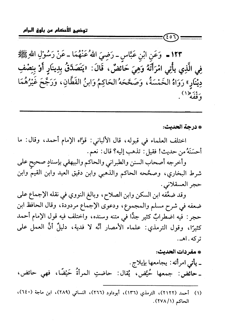123 - وَعَنِ ابْنِ عَبَّاسٍ -رَضِيَ اللَّهُ عَنْهُمَا- عَنِ رَسُوْلِ الله -صلى الله عليه وسلم- فِي الَّذِي يَأْتِي امْرَأَتَهُ وَهِيَ حَائِضٌ، قَالَ: "يَتَصَدَّقُ بِدِينَارٍ أَوْ نِصْفِ دِيْنَارٍ" رَوَاهُ الْخَمْسَةُ, وَصَحَّحَهُ الْحَاكِمُ وَابْنُ الْقَطَّانِ, وَرَجَّحَ غَيْرَهُمَا وَقْفَهُ (¬1).