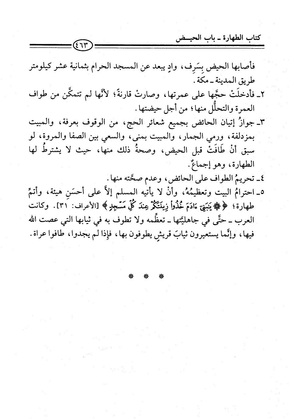 3 - جوازُ إتيان الحائض بجميع شعائر الحج، من الوقوف بعرفة، والمبيت بمزدلفة، ورمي الجمار، والمبيت بمنى، والسعي بين الصفا والمروة، لو سبق أنْ طَافَتْ قبل الحيض، وصحةُ ذلك منها، حيث لا يشترطُ لها الطهارة، وهو إجماعٌ.