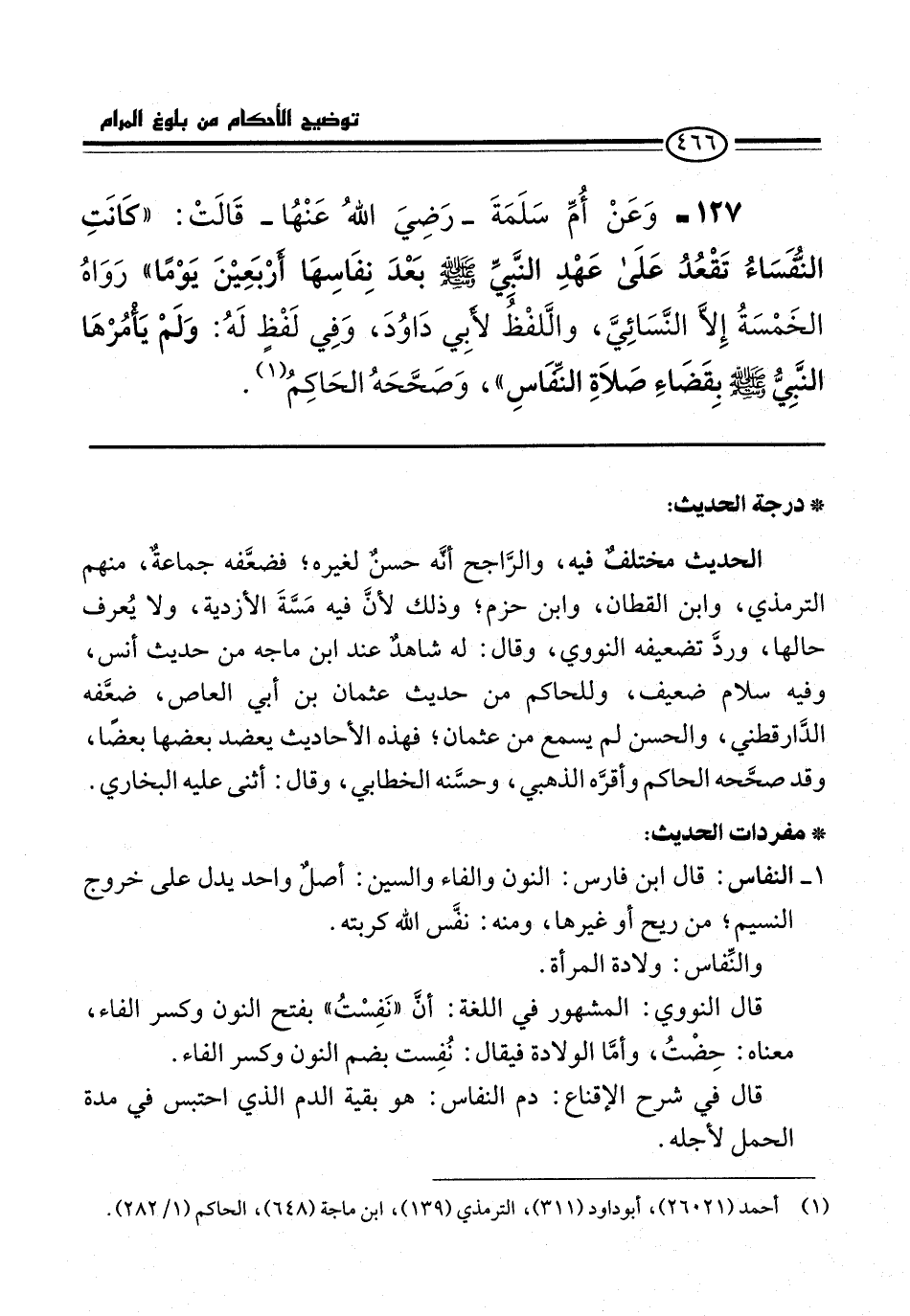 127 - وَعَنْ أُمِّ سَلَمَةَ -رَضِيَ اللَّهُ عَنْهَا- قَالَتْ: "كَانَتِ النُّفَسَاءُ تَقْعُدُ عَلَى عَهْدِ النَّبيِّ -صلى الله عليه وسلم- بَعْدَ نِفَاسِهَا أَرْبَعِينَ يَوْماً" رَوَاهُ الْخَمْسَةُ إِلَّا النَّسَائِيَّ, وَاللَّفْظُ لِأَبِي دَاوُدَ، وَفِي لَفْظٍ لَهُ: وَلَمْ يَأْمُرْهَا النَّبِيُّ -صلى الله عليه وسلم- بِقَضَاءِ صَلَاةِ النِّفَاسِ"، وَصَحَّحَهُ الْحَاكِمُ (¬1).