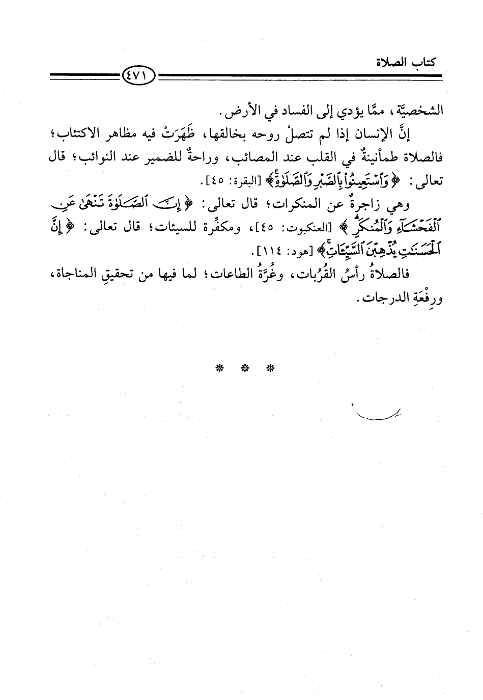 إنَّ الإنسان إذا لم تتصلْ روحه بخالقها، ظَهَرَتْ فيه مظاهر الاكتئاب؛ فالصلاة طمأنينةٌ في القلب عند المصائب، وراحةٌ للضمير عند النوائب؛ قال تعالي: {وَاسْتَعِينُوا بِالصَّبْرِ وَالصَّلَاةِ} [البقرة: 45].